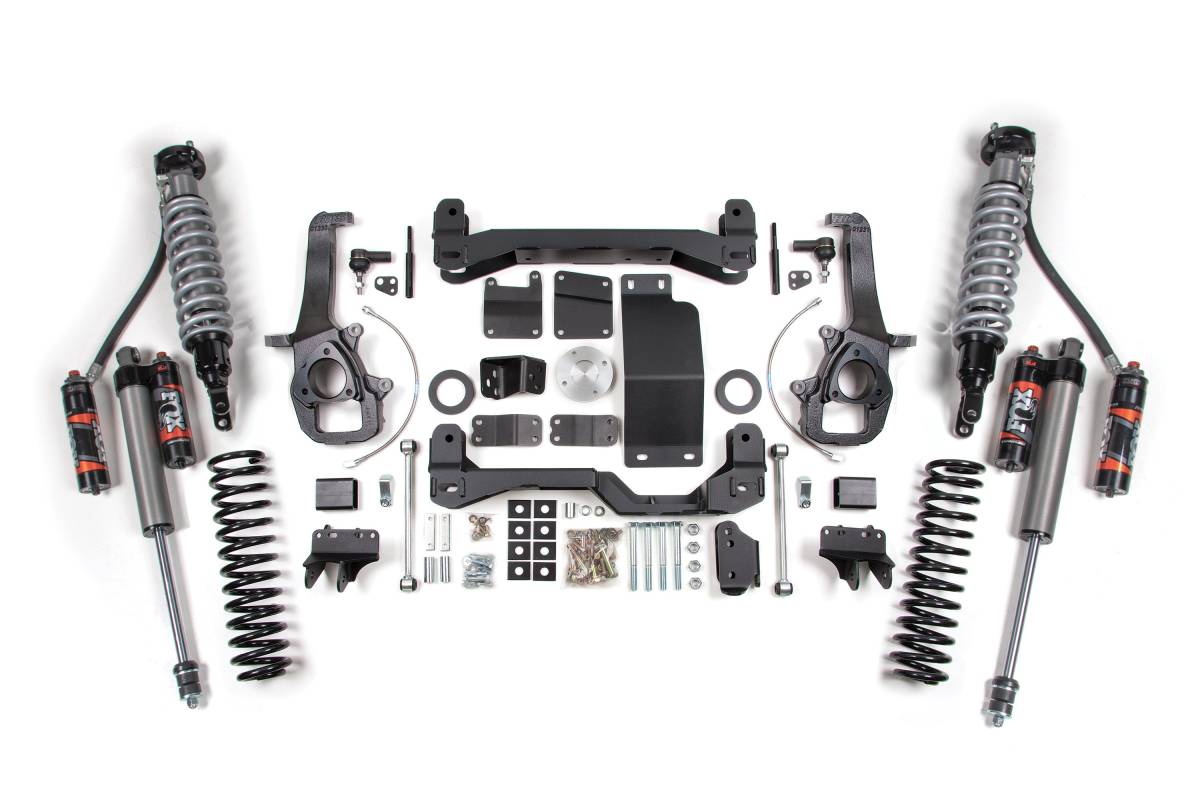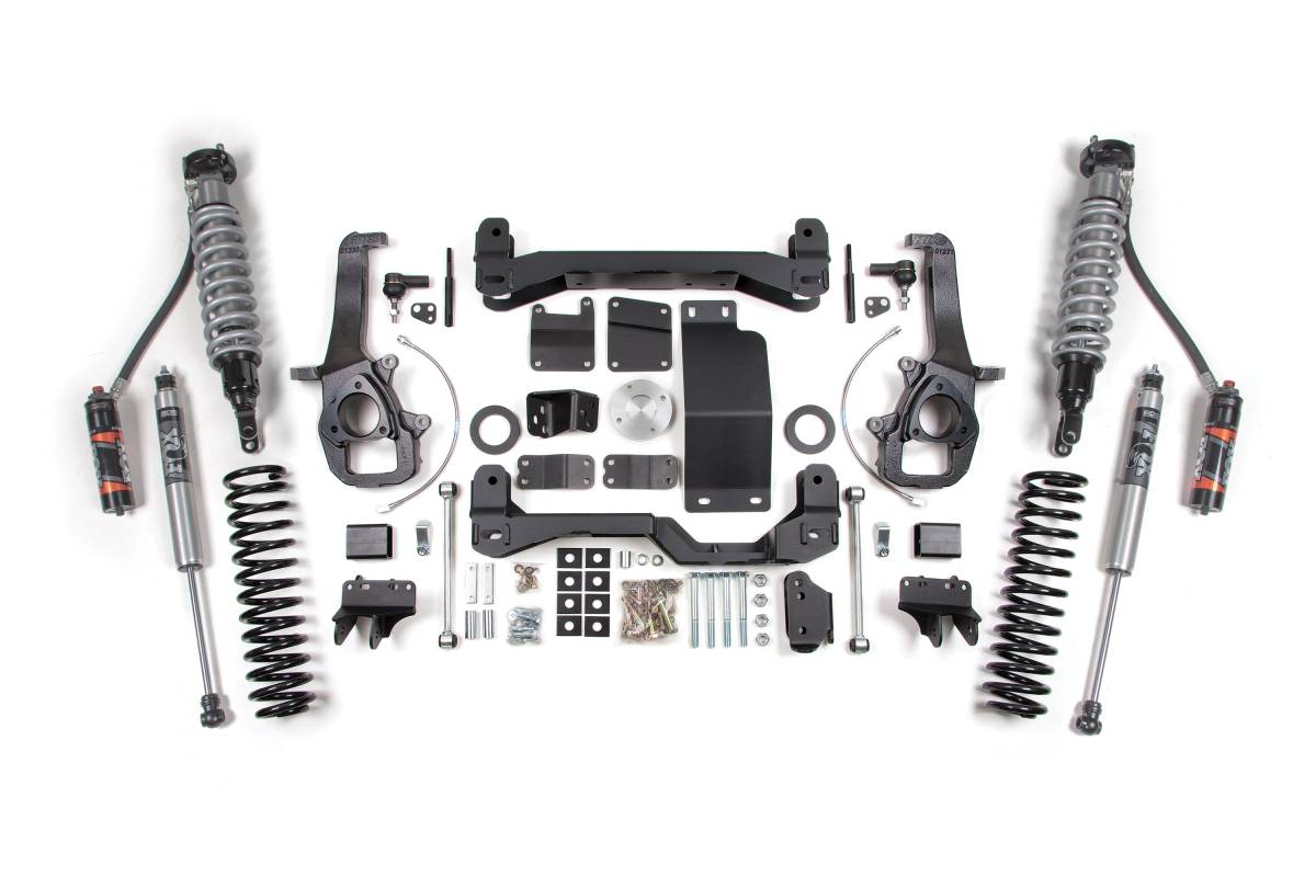 This BDS 6" Coilover Lift Kit is designed for unmatched performance, stance, and strength for the 2012 Ram 1500 4WD. This premium system clears up to 37" tires and replaces factory components with heavy-duty, high-clearance parts built to handle any terrain. Up front, FOX 2.5 Performance Elite Coilovers with DSC provide adjustable damping for ultimate control on- or off-road, complemented by 1/4" steel high-clearance crossmembers, HD skid plates, and CNC-machined ductile iron steering knuckles that maintain proper geometry and ESC compatibility. Out back, progressive-rate Pro-Ride coil springs deliver comfort and control, while relocation brackets correct pinion and axle geometry. Rear shock options include FOX 2.5 Performance Elite or FOX 2.0 Performance Series.