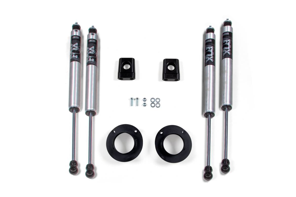 This 2-inch leveling kit from BDS Suspension is designed to level the front of 2014–2026 RAM 2500 4WD trucks, improving stance and providing clearance for up to 35-inch tires. The kit includes steel fabricated coil spacers, extended bump stops, and custom-tuned shocks, with everything necessary for a complete installation at an affordable price.