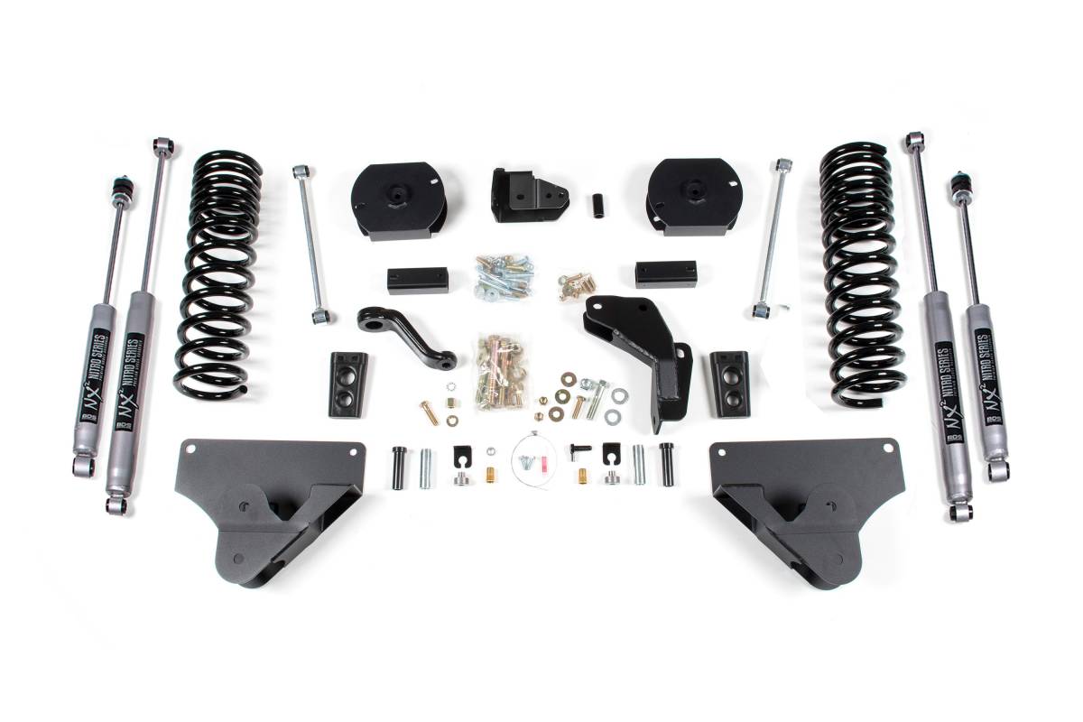 This 4-inch lift kit from BDS Suspension is designed for 2014–2018 RAM 2500 diesel-powered 4WD trucks. The kit improves stance, performance, and capability while providing clearance for up to 35-inch tires. Up front, the kit includes diesel-specific Pro-Ride coil springs, radius arm drop brackets, a forged drop pitman arm, a track bar bracket for steering correction, bump stops, and brake line brackets. In the rear, the kit utilizes progressive rate Pro-Ride coil springs (or coil spacers, depending on configuration), a track bar relocation bracket, bump stop extensions, sway bar links, and matching shocks. Pro-Ride coil springs are full-length, diesel-specific, and manufactured from high tensile steel as direct OE replacements engineered with properly sized wire diameter for maximum reliability without premature coil bind. A forged drop pitman arm minimizes steering angle, and a heavy duty track bar drop bracket keeps steering geometry in phase through suspension travel while recentering the front axle.