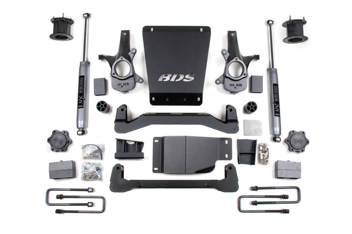 This BDS 4.5-inch lift kit is engineered for 2007–2013 Chevy Silverado and GMC Sierra 1500 4WD trucks. The kit provides clearance for up to 33-inch tires while improving stance, ground clearance, and off-road capability. It takes advantage of BDS's high-clearance design to correct suspension and steering geometry at the new ride height, preserving on-road handling characteristics.