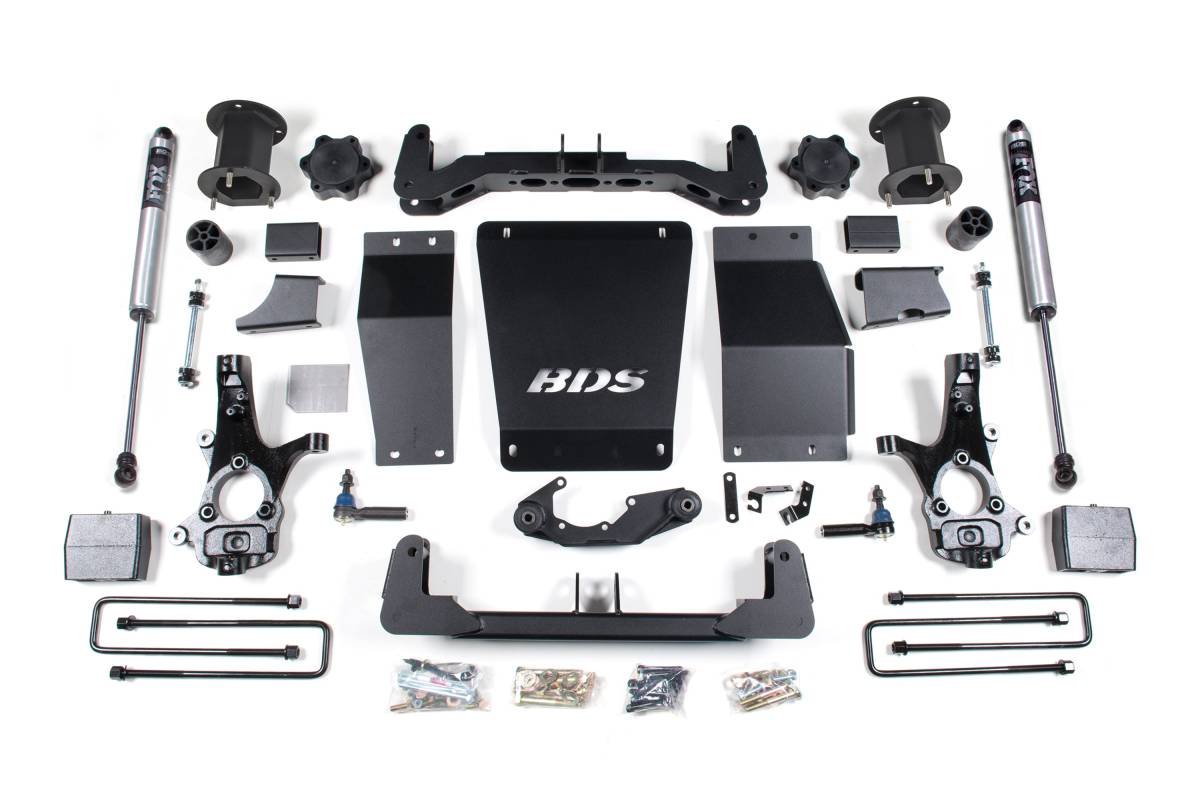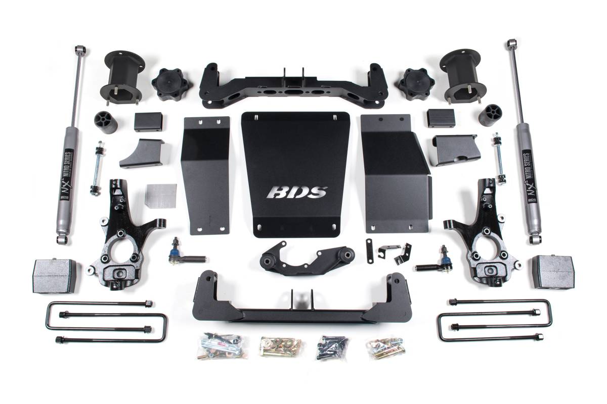 The BDS 6.5-inch lift kit is designed for 2014–2018 Chevy Silverado and GMC Sierra 1500 4WD trucks, providing improved stance, performance, and capability with clearance for up to 35-inch tires. The kit uses a high-clearance design to improve ground clearance, strength, and off-road protection while correcting suspension and steering geometry for on-road handling.