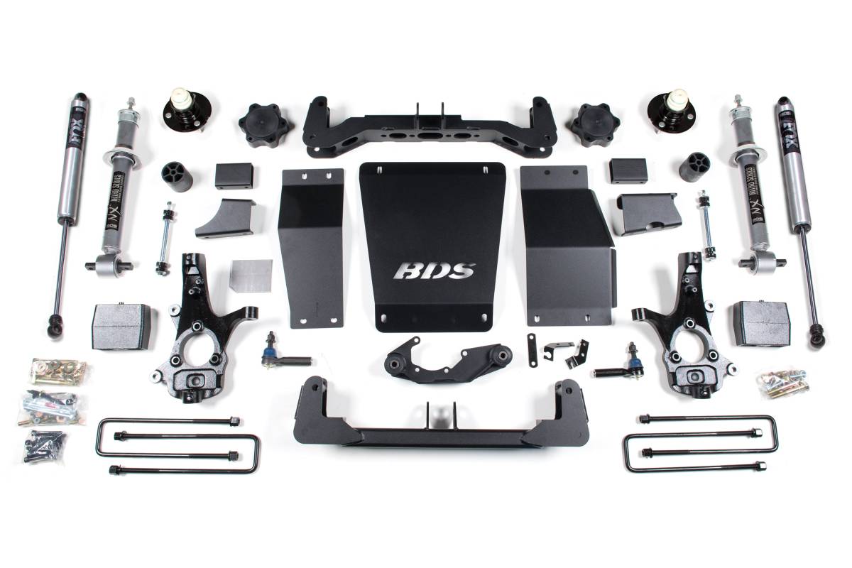 The BDS 6-inch lift kit for the 2014–2018 Chevy Silverado and GMC Sierra 1500 4WD is engineered to improve stance, off-road performance, and capability, providing clearance for up to 35-inch tires. The kit uses BDS's high-clearance design to improve ground clearance, strength, and off-road protection while correcting suspension and steering geometry for on-road handling. Up front, the kit utilizes full-length replacement strut shocks, high-arched 1/4-inch thick steel crossmembers, a multipiece differential relocation bracket system, and heavy-duty skid plates. Steering geometry is corrected at the new ride height with CNC-machined ductile iron steering knuckles. Sway bar drops, bump stop extensions, brake line brackets, CV spacers, and all necessary hardware are also included. In the rear, buyers may choose between a replacement lift block or a full Glide-Ride leaf spring option, paired with new U-bolts, brake line brackets, and either NX2 Nitro or FOX 2.0 Performance Series rear shocks.