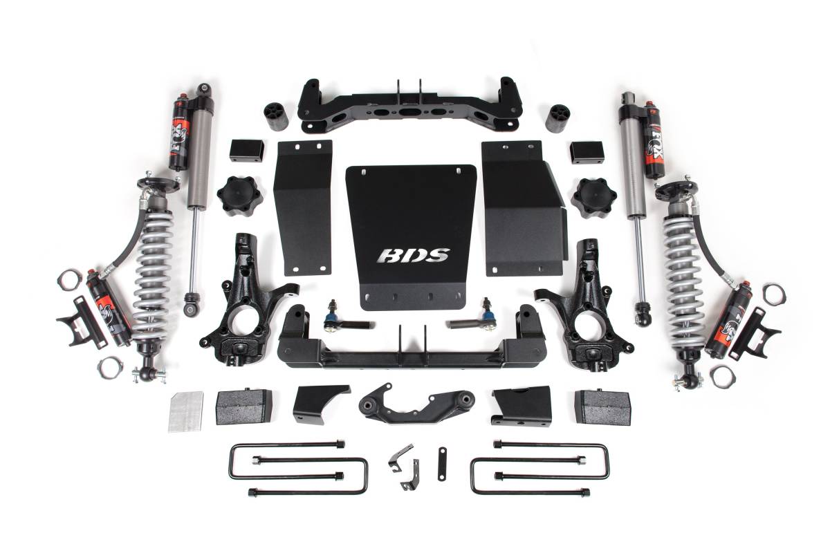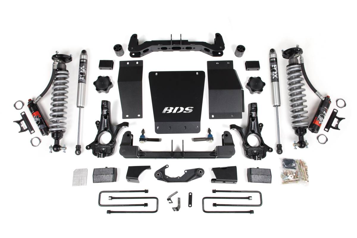 This BDS 4-inch lift kit is designed for 2014–2018 Chevy Silverado and GMC Sierra 1500 4WD trucks, providing clearance for up to 33-inch tires. The kit uses a high-clearance design to improve ground clearance, strength, and off-road protection while correcting suspension and steering geometry for on-road handling.