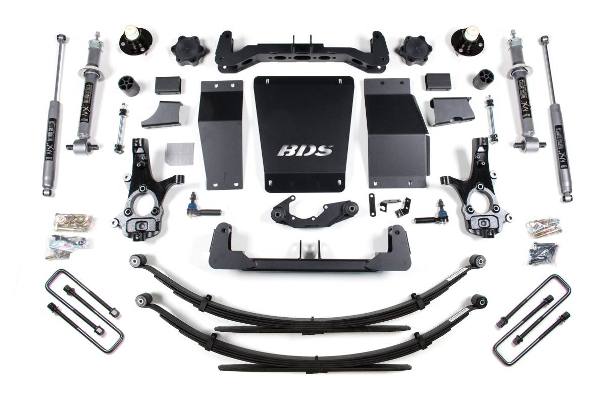 The BDS 6-inch lift kit for the 2014–2018 Chevy Silverado and GMC Sierra 1500 4WD is engineered to improve stance, off-road performance, and capability, providing clearance for up to 35-inch tires. The kit uses BDS's high-clearance design to improve ground clearance, strength, and off-road protection while correcting suspension and steering geometry for on-road handling. Up front, the kit utilizes full-length replacement strut shocks, high-arched 1/4-inch thick steel crossmembers, a multipiece differential relocation bracket system, and heavy-duty skid plates. Steering geometry is corrected at the new ride height with CNC-machined ductile iron steering knuckles. Sway bar drops, bump stop extensions, brake line brackets, CV spacers, and all necessary hardware are also included. In the rear, buyers may choose between a replacement lift block or a full Glide-Ride leaf spring option, paired with new U-bolts, brake line brackets, and either NX2 Nitro or FOX 2.0 Performance Series rear shocks.