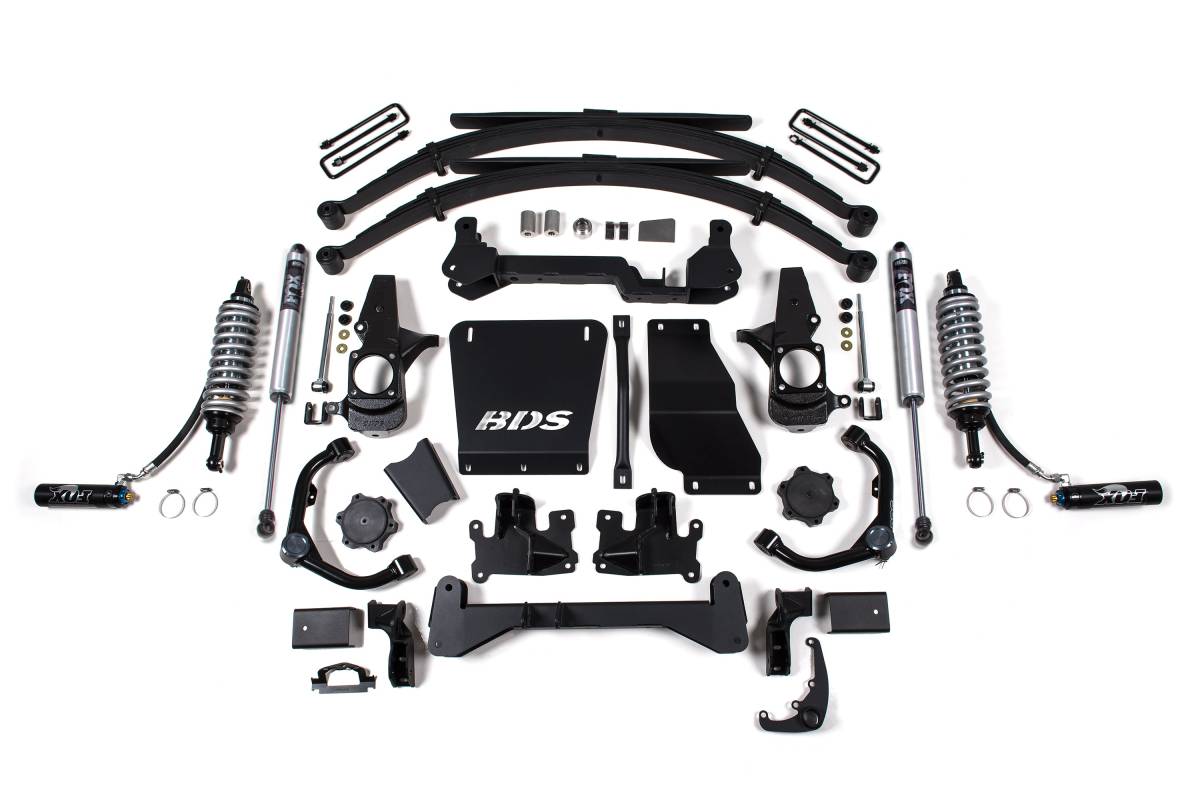 BDS Suspension's 6.5-inch suspension lift kit with FOX 2.5 Coilover conversion is engineered for the 2001–2010 Chevy Silverado and GMC Sierra 2500HD/3500HD diesel trucks. Designed to improve stance, performance, and capability, this kit provides clearance for up to 35-inch tires. Up front, the kit utilizes FOX 2.5 coilover shocks, heavy-duty tubular upper control arms, high-arched 1/4-inch-thick steel crossmembers, multipiece differential relocation brackets, and heavy-duty skid plates. CNC-machined ductile iron steering knuckles correct steering geometry at the new ride height. Sway bar drops, bump stop extensions, brake line brackets, CV spacers, and all required hardware are included for a comprehensive front suspension lift. In the rear, the kit is available with either a replacement lift block or complete Glide-Ride leaf spring option, paired with precision-tuned FOX 2.0 Performance Series shocks and new u-bolts.