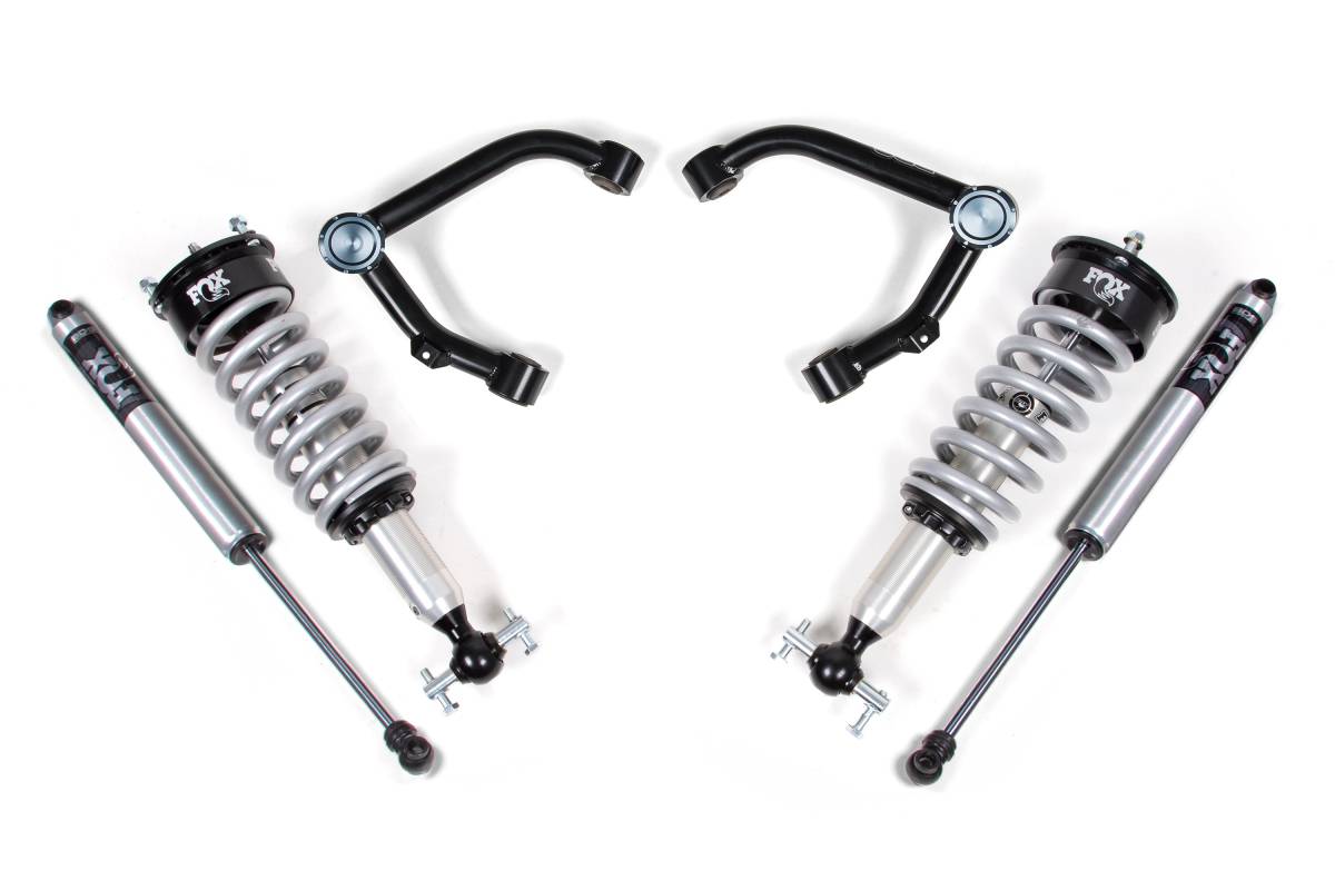 This 2-inch leveling kit for 2007–2018 Chevy Silverado and GMC Sierra 1500 4WD trucks improves stance, ride performance, and capability using FOX 2.0 Performance Series coilover shocks and heavy-duty tubular upper control arms. The kit includes everything needed to level the truck and provides clearance for tires up to 33 inches. Front lift is achieved via FOX 2.0 coilover struts paired with HD upper control arms, while matching FOX 2.0 Performance Series shocks are included for the rear.