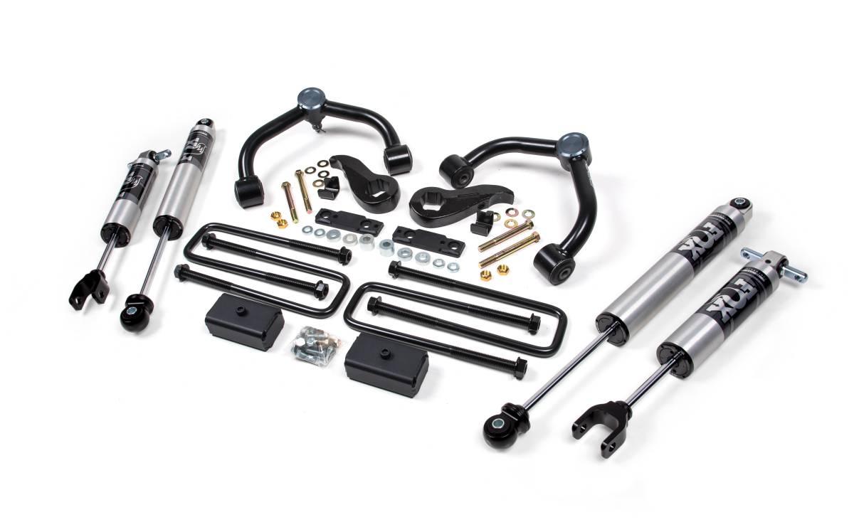 This 3-inch leveling lift kit from BDS Suspension is designed for 2020-2026 Chevy Silverado and GMC Sierra 2500HD 4WD trucks. The kit improves stance, performance, and capability while providing clearance for up to 35-inch tires. Up front, the kit includes your choice of FOX shocks along with heavy-duty tubular upper control arms, indexed cast steel torsion bar keys, a differential relocation kit to correct CV axle operating angles, and sway bar relocation brackets to maintain proper operating angle. In the rear, a 2-inch block and u-bolt kit creates a level to slightly tail-high stance when unloaded, paired with application-matched FOX rear shocks.