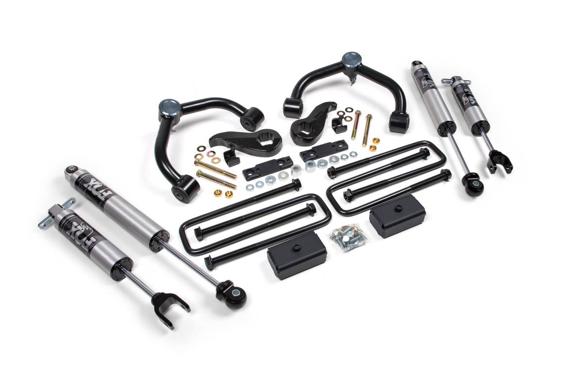 This 3-inch leveling lift kit from BDS Suspension is designed for 2020-2026 Chevy Silverado and GMC Sierra 2500HD 4WD trucks. The kit improves stance, performance, and capability while providing clearance for up to 35-inch tires. Up front, the kit includes your choice of FOX shocks along with heavy-duty tubular upper control arms, indexed cast steel torsion bar keys, a differential relocation kit to correct CV axle operating angles, and sway bar relocation brackets to maintain proper operating angle. In the rear, a 2-inch block and u-bolt kit creates a level to slightly tail-high stance when unloaded, paired with application-matched FOX rear shocks.