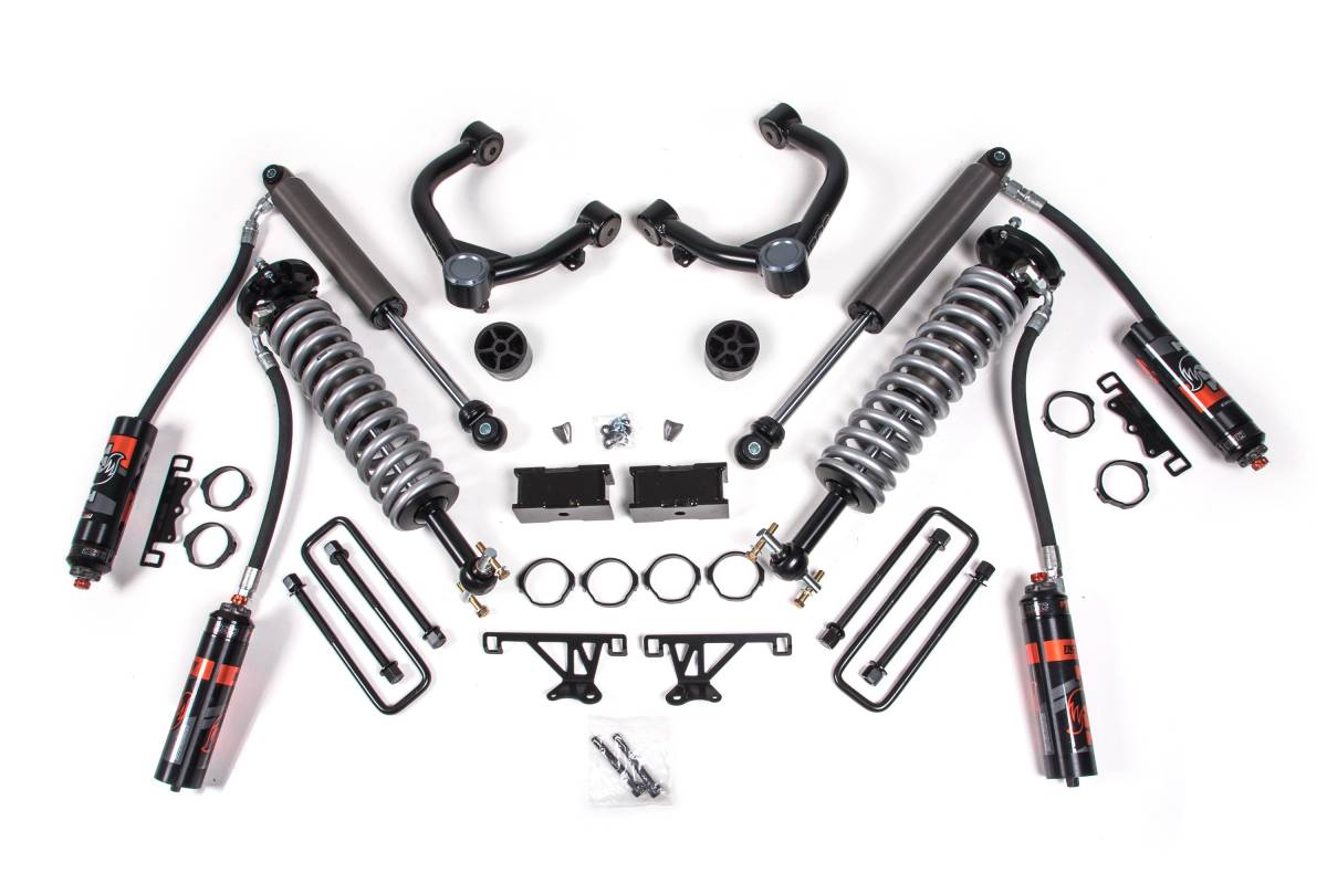 This 1.5-inch lift kit for the Chevy Trail Boss and GMC AT4 1500 (2019–2024) 4WD is designed to improve stance, performance, and capability. The kit includes FOX 2.5 Performance Elite Series remote reservoir coil-over shocks and heavy duty tubular upper control arms up front, and fabricated steel lift blocks, longer U-bolts, and rear shocks in the back. The kit provides clearance for up to 35-inch tires on Chevy models or up to 33-inch tires on GMC models and installs as a 100% bolt-on solution.