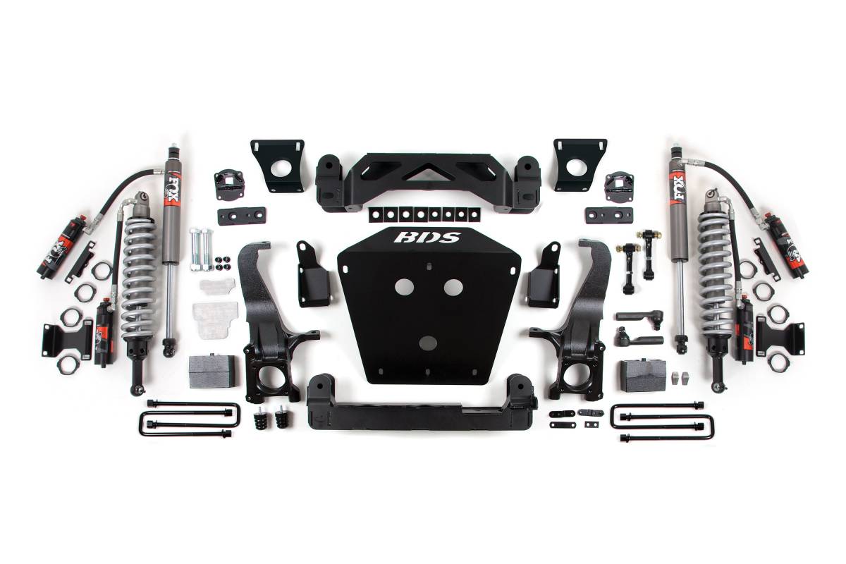 The BDS Suspension 5-inch Lift Kit for the 2007–2015 Toyota Tundra (2WD/4WD) is engineered to deliver enhanced off-road capability and ground clearance while maintaining on-road drivability. The kit combines BDS Upper Control Arms, Heavy Duty Steering Knuckles, High Clearance Crossmembers, a front skid plate system, and FOX 2.5 Performance Elite Coilovers to upgrade suspension geometry, wheel travel, and ride quality. BDS Upper Control Arms are constructed from 1.5-inch tubular steel with an indexed ball joint and factory-style rubber bushings to maximize wheel travel with maintenance-free operation. The CNC-machined ductile cast iron steering knuckles correct steering geometry at the new ride height, working with factory tie rod ends to maintain proper steering angles and ESC system compatibility. The high clearance crossmember design uses 1/4-inch thick laser-cut steel and bolts together with a front skid plate to form a rigid subframe with added underside protection. Multipoint differential relocation brackets secure the front axle and improve CV angles.