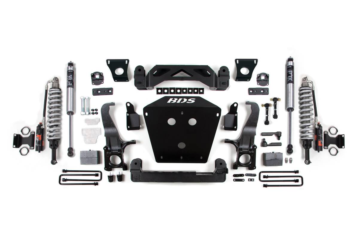 The BDS Suspension 5-inch Lift Kit for the 2007–2015 Toyota Tundra (2WD/4WD) is engineered to deliver enhanced off-road capability and ground clearance while maintaining on-road drivability. The kit combines BDS Upper Control Arms, Heavy Duty Steering Knuckles, High Clearance Crossmembers, a front skid plate system, and FOX 2.5 Performance Elite Coilovers to upgrade suspension geometry, wheel travel, and ride quality. BDS Upper Control Arms are constructed from 1.5-inch tubular steel with an indexed ball joint and factory-style rubber bushings to maximize wheel travel with maintenance-free operation. The CNC-machined ductile cast iron steering knuckles correct steering geometry at the new ride height, working with factory tie rod ends to maintain proper steering angles and ESC system compatibility. The high clearance crossmember design uses 1/4-inch thick laser-cut steel and bolts together with a front skid plate to form a rigid subframe with added underside protection. Multipoint differential relocation brackets secure the front axle and improve CV angles.