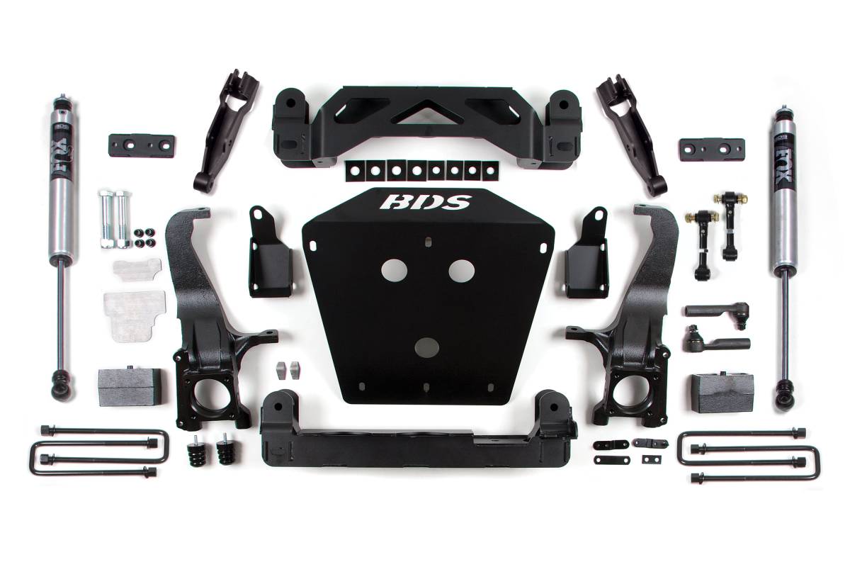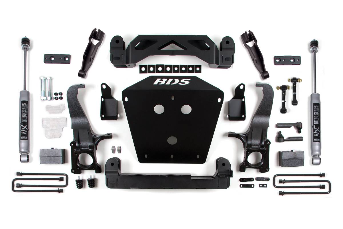 BDS steps up the performance and capability of the 2007–2015 Toyota Tundra 2WD/4WD trucks with a 4.5-inch suspension lift kit designed to improve stance, performance, and capability, providing clearance for up to 35-inch tires. Up front, the kit utilizes a lower strut extension, high-arched 1/4-inch thick steel crossmembers, multipiece differential relocation brackets, and heavy duty skid plates built for off-road protection. Steering geometry is corrected at the new taller ride height with CNC-machined ductile iron steering knuckles utilizing replacement tie rod ends, allowing for ESC system compatibility. The kit also includes sway bar drops, bump stop extensions, brake line brackets, and supplied hardware. In the rear, the kit uses heavy duty cast steel lift blocks, a brake line bracket, and longer U-bolts, complemented by your choice of specially tuned rear shocks.