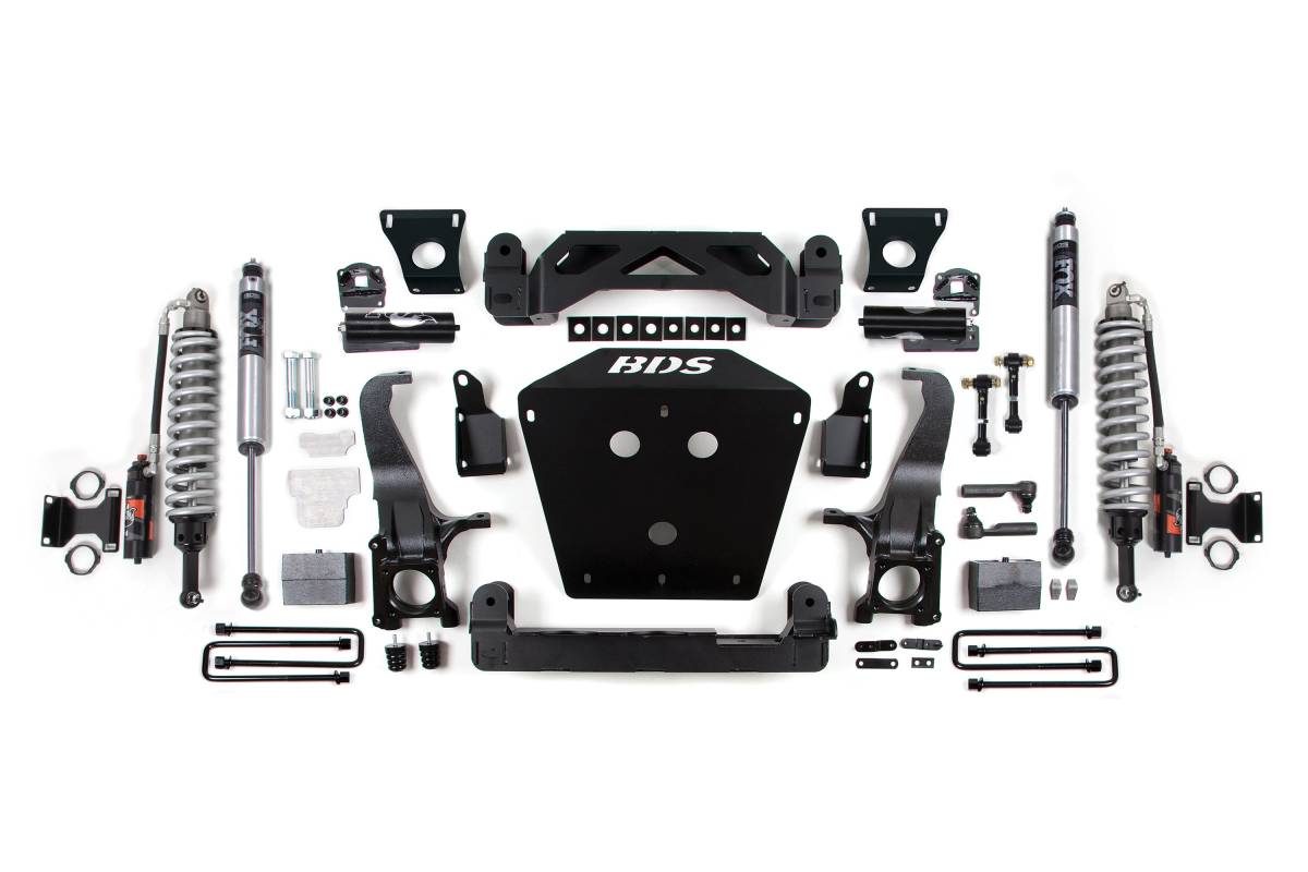 The BDS Suspension 7-inch Lift Kit for the Toyota Tundra (2016–2021) 2/4WD combines BDS Steering Knuckles, FOX Performance Elite Coil-Overs, and rear shocks into a comprehensive lift system engineered for both off-road performance and on-road comfort. High clearance crossmembers and a front skid plate system form a rigid subframe that maximizes ground clearance and adds undercarriage protection. CNC machined ductile cast iron steering knuckles maintain factory steering geometry at the new ride height, preserving proper function and ESC system compatibility. Multipoint differential relocation brackets secure the front axle and improve CV angles. The kit accommodates larger tires and increases ground clearance for tackling demanding terrain. A Factory Protection Plus drivetrain warranty is included.