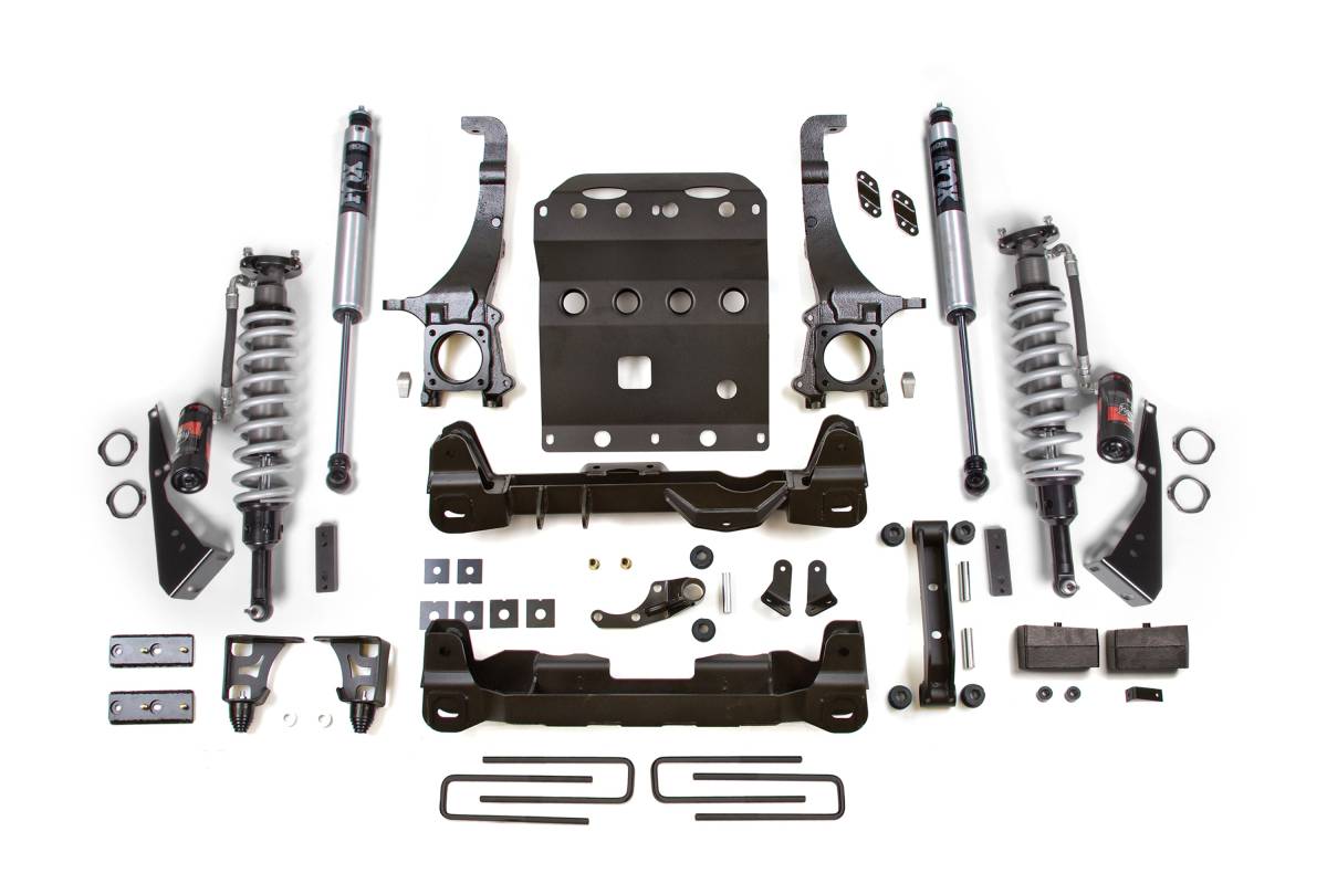 Up front, the FOX 2.5 PE coil-overs are paired with high-arched 1/4-inch thick steel crossmembers, multipiece differential relocation brackets, and heavy-duty skid plates. CNC-machined ductile iron steering knuckles utilize factory tie rod ends to maintain ESC system compatibility. The kit also includes sway bar drops, bump stop extensions, brake line brackets, lower control arm cams, FOX reservoir mounts, and all required hardware. In the rear, heavy-duty cast steel lift blocks, a brake line bracket, and longer U-bolts lift and level the stance without affecting load capacity.