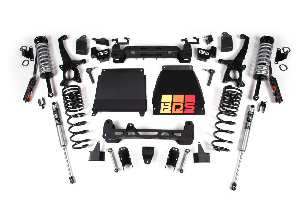 The BDS 5-inch suspension lift kit for the 2022–2026 Toyota Tundra 4WD pairs FOX 2.5 Performance Elite (PE) coil-overs up front with a choice of FOX rear shocks to improve stance, performance, and off-road capability. The kit is designed around BDS's high-clearance architecture and provides clearance for up to 37-inch tires while correcting suspension and steering geometry for confident on-road handling.