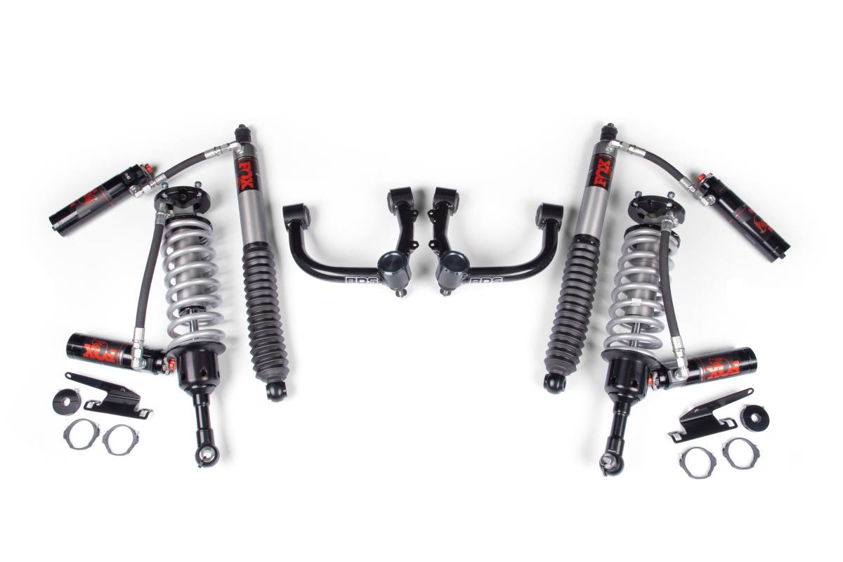 The BDS 2-inch Coilover Shock Leveling Kit combines premium FOX coilover technology with heavy-duty BDS tubular upper control arms to improve suspension geometry, increase wheel travel, and deliver long-term durability for the 2024–2025 Toyota Tacoma. This system is available with multiple FOX shock options — FOX 2.0 Performance Series, FOX 2.5 Performance Series HTO, FOX 2.5 Performance Elite, and FOX 3.0 Factory Race Series IBP — allowing you to select the level of on- and off-road performance that best matches your driving needs. The coilover and upper control arm combination levels the truck, improves front-end clearance, and fits 33-inch tires, all backed by the BDS No Fine Print Warranty.