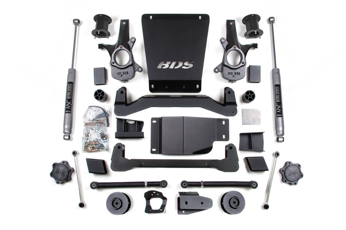 This BDS 4.5-inch lift kit is engineered for 2007–2014 Chevrolet Avalanche, Suburban, and Tahoe and GMC Yukon 1500 4WD trucks. The kit includes everything required to lift the vehicle while providing clearance for up to 33-inch tires. It utilizes a high-clearance design to improve ground clearance, strength, and off-road protection, while correcting suspension and steering geometry for proper on-road handling.