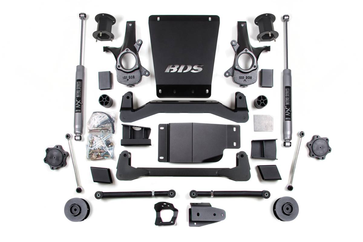 This BDS 4.5-inch lift kit is engineered for 2007–2014 Chevrolet Avalanche, Suburban, and Tahoe and GMC Yukon 1500 4WD trucks. The kit includes everything required to lift the vehicle while providing clearance for up to 33-inch tires. It utilizes a high-clearance design to improve ground clearance, strength, and off-road protection, while correcting suspension and steering geometry for proper on-road handling.