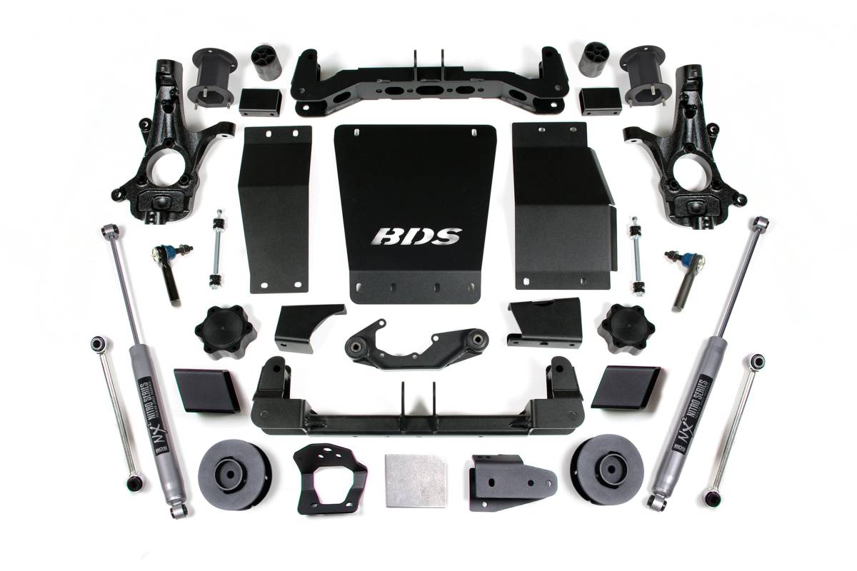 This BDS 4.5-inch lift kit is designed for 2015-2020 Chevy Suburban, Tahoe, and GMC Yukon 1500 4WD models. The kit improves stance, performance, and capability while providing clearance for up to 33-inch tires. It utilizes a high-clearance design to improve ground clearance, strength, and off-road protection, while correcting suspension and steering geometry for proper on-road handling.