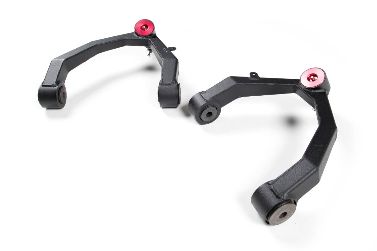 Upgrade your truck's factory upper control arms with these high-strength Adventure Series control arms from Zone Offroad. Designed as a direct replacement for 2007–2018 Chevrolet and GMC 1500 trucks and SUVs equipped with factory cast steel control arms, these arms improve strength and increase suspension droop travel. Built from high-strength steel with boxed, gusseted, and fully welded construction, they deliver enhanced rigidity for demanding use. OE-style rubber bushings at the frame mount provide long-lasting, maintenance-free operation and quiet ride quality. A CNC-machined, indexed ball joint cup positions the ball joint optimally for leveling and lifted applications. High-strength, greaseable ball joints are included with a protective cap to keep out dirt and debris. These upper control arms arrive fully assembled and ready to bolt in.