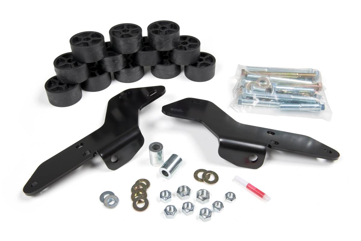 This 1.5" body lift kit from Zone Offroad is designed for the 2007–2013 Chevrolet Avalanche. It raises the body and bumpers off the frame to create clearance for larger tires while maintaining factory body lines. The kit includes crush-proof reinforced nylon body mount blocks, high-quality hardware, and bumper brackets for a straightforward installation.