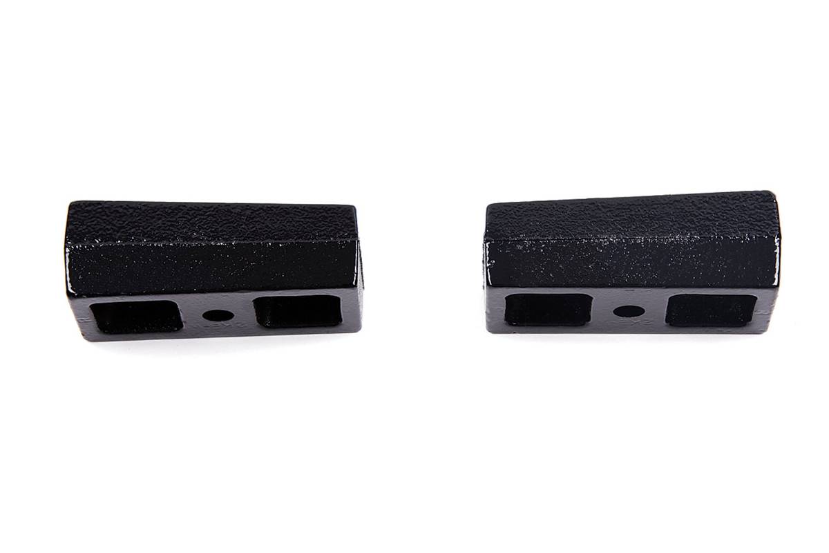These high-quality 2" cast iron lift blocks are specially designed to lift the rear of leaf spring trucks. They feature a black e-coat finish and a tapered design to help improve pinion angle once installed. Uses 5/8" pin size. Sold in pairs.