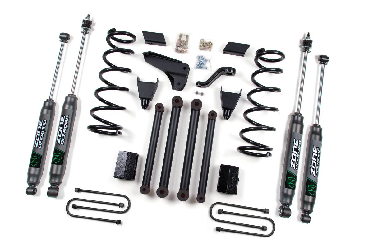 This 5-inch lift kit is designed for the 2010–2013 Dodge/Ram 2500/3500 4WD truck. It provides the clearance needed for tires up to 36 inches and includes all components required to raise and level the vehicle. The kit uses a 100% bolt-on design and addresses steering, axle positioning, caster correction, and bump travel in a single package.