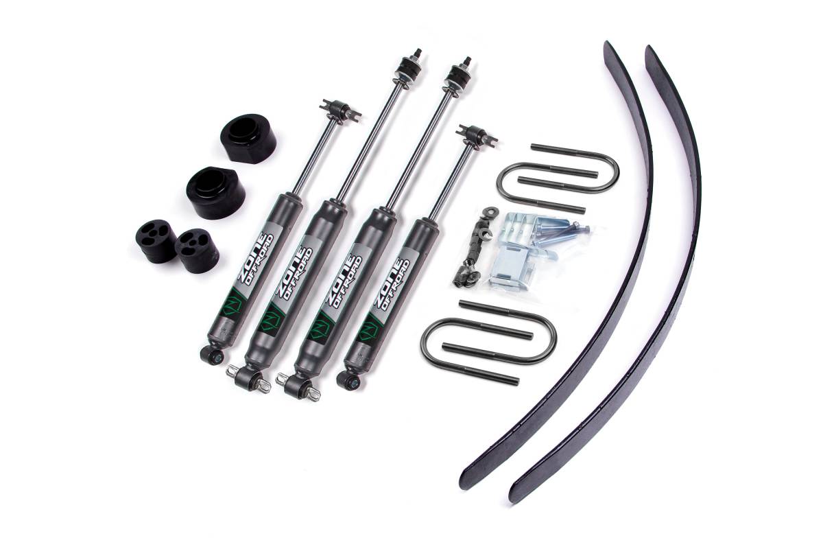 This 2-inch lift kit from Zone Offroad is designed for the Jeep Cherokee XJ (1984–2001). The kit includes polyurethane coil spacers, bolt-in bump stop extensions, a rear add-a-leaf kit, new center pins, clamps, and replacement U-bolts to level the stance and provide clearance for larger tires while retaining factory ride quality.