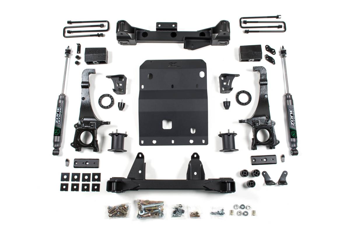 This 6-inch lift kit from Zone Offroad is designed for 2016–2023 Toyota Tacoma 4WD trucks. The kit includes everything needed to achieve the lift, from high-strength crossmembers and ductile iron steering knuckles to strut spacers and a rear block kit to level the stance. The kit provides clearance for up to 35-inch tires.