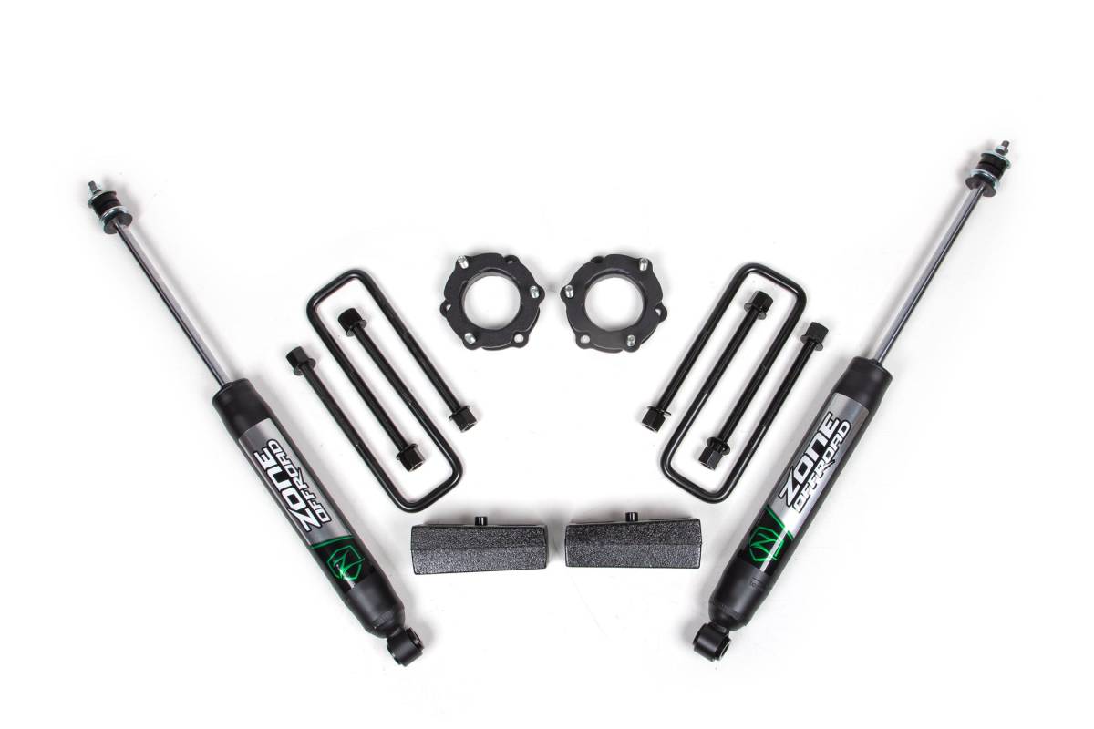This 2.5-inch strut spacer leveling kit for the 2005–2023 Toyota Tacoma 4WD combines a top-mounted front strut spacer with 2-inch rear lift blocks and U-bolts to level the truck and provide up to 2–3.5 inches of total lift. No strut disassembly is required. The kit provides clearance to run 265/75 tires.