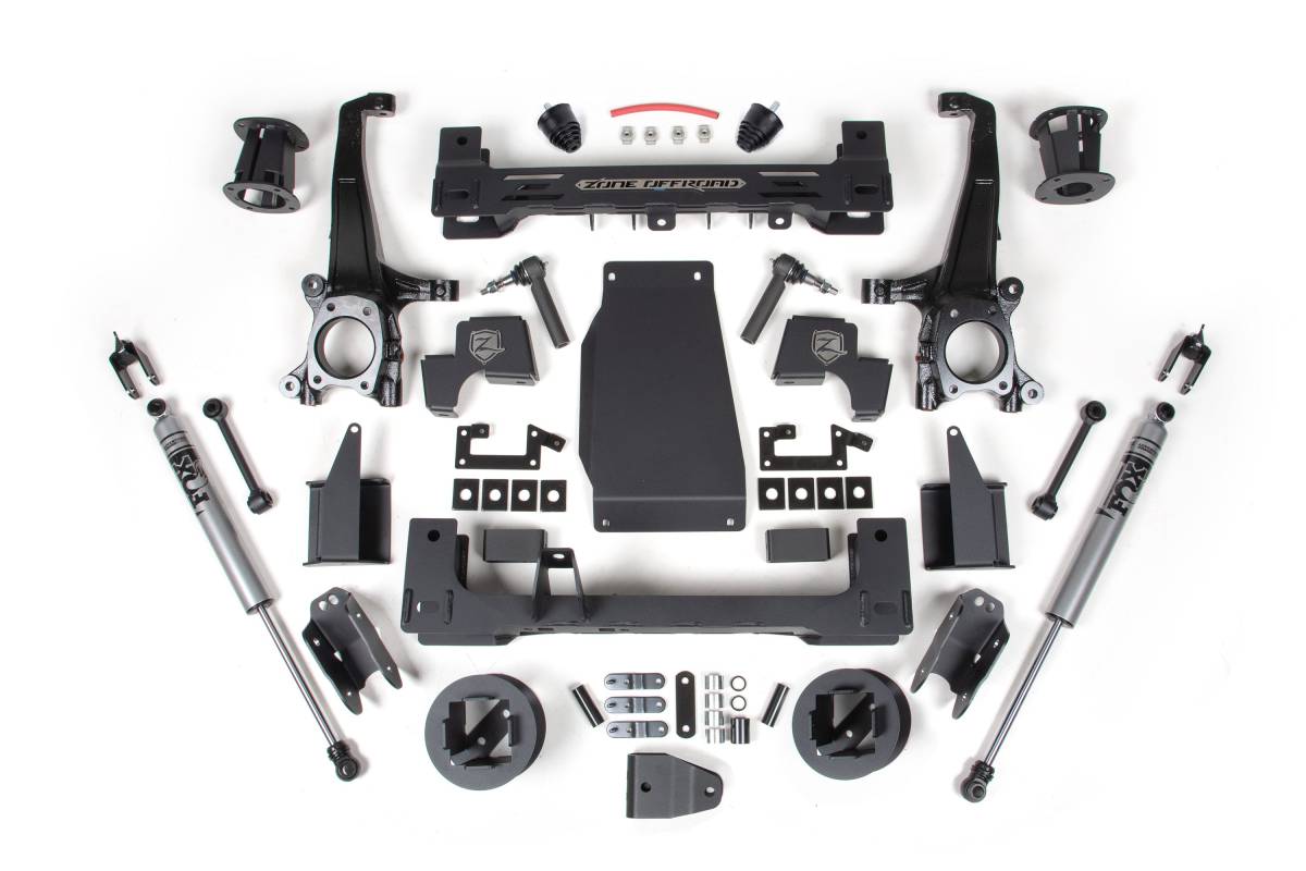 The Zone Offroad 6" Lift Kit is designed specifically for 2022–2026 Toyota Tundra 4WD models and manufactured in the USA. This kit delivers 6 inches of front lift while leveling the front and rear of the truck, providing enhanced ground clearance and fitment for 37-inch tires. Engineered to correct drivetrain geometry and eliminate common lift-related vibrations, the kit uses a bolt-in ready, fully welded strut spacer design to maintain factory ride quality and handling characteristics. Available with either Zone Nitro or FOX Adventure Series 2.0 rear shocks.