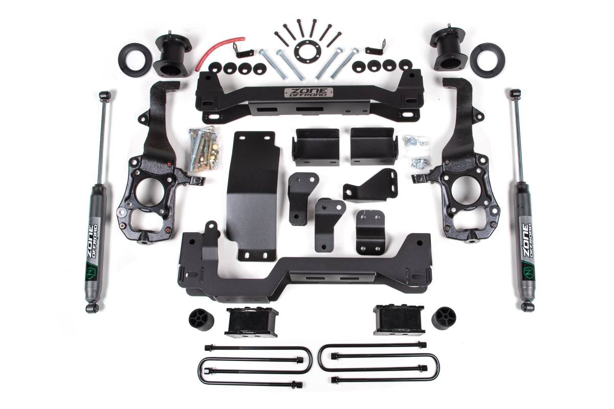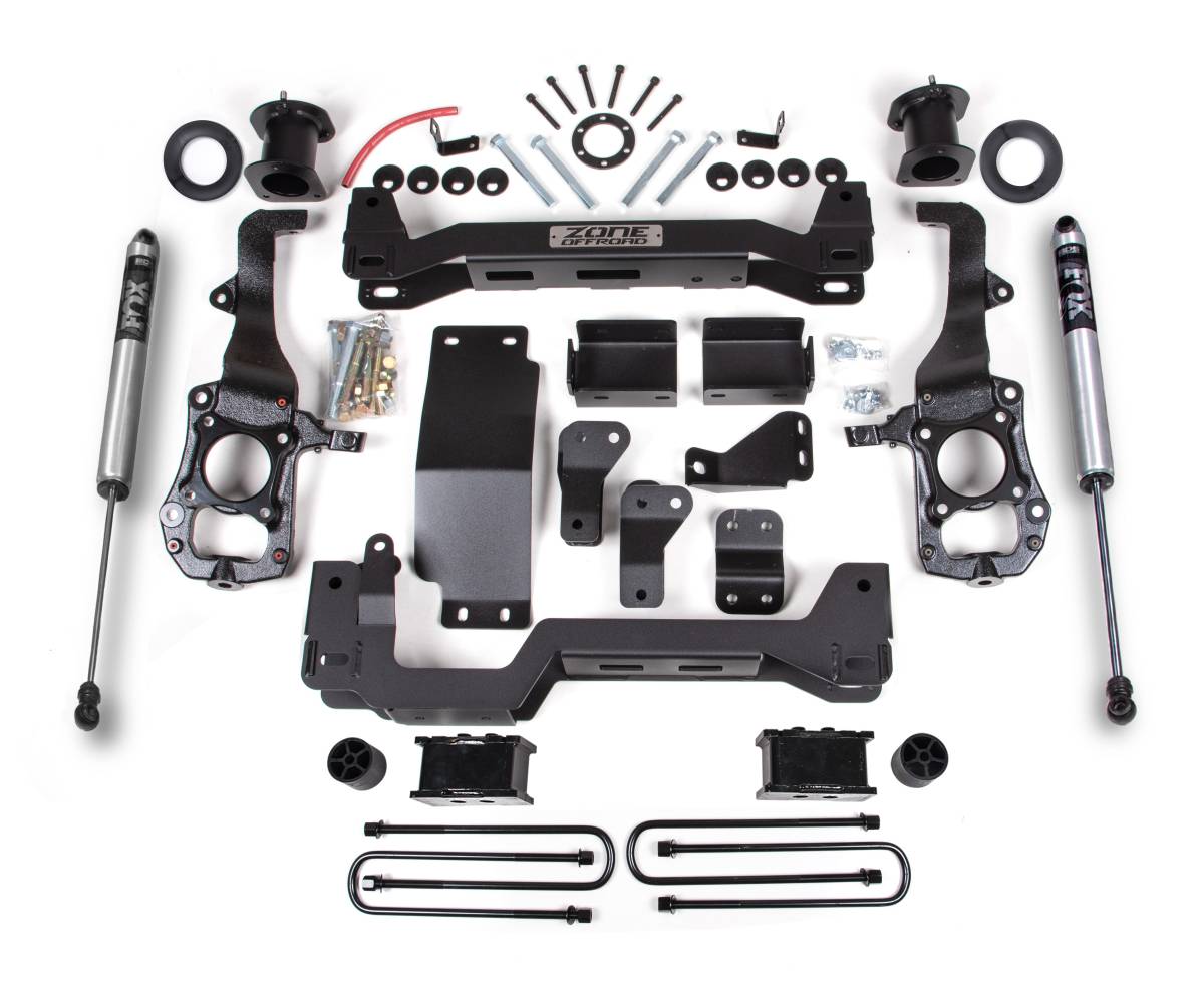 This 5" lift kit from Zone Offroad is designed for the Ford F-150 Tremor 4WD (2021–2026). The kit includes everything needed to raise the truck's stance, from high-strength crossmembers and ductile iron steering knuckles to strut spacers and a rear block kit. The result is improved ground clearance with fitment for tires up to 37".