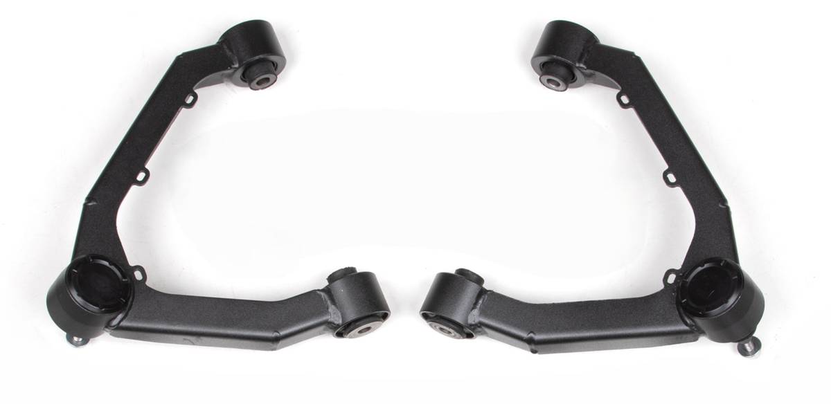 Upgrade your truck's factory upper control arms with these high-strength Adventure Series control arms from Zone Offroad. Designed as a direct replacement, these arms improve strength and increase suspension droop travel. Built from high-strength steel with boxed, gusseted, and fully welded construction, they deliver lasting rigidity. OE-style rubber bushings at the frame mount provide long, maintenance-free service and quiet operation. An indexed ball joint cup at the outer end is designed for use with leveling and lifted applications. High-strength ball joints are included with a protective cap to keep debris out. These upper control arms come fully assembled and ready to bolt in right out of the box.