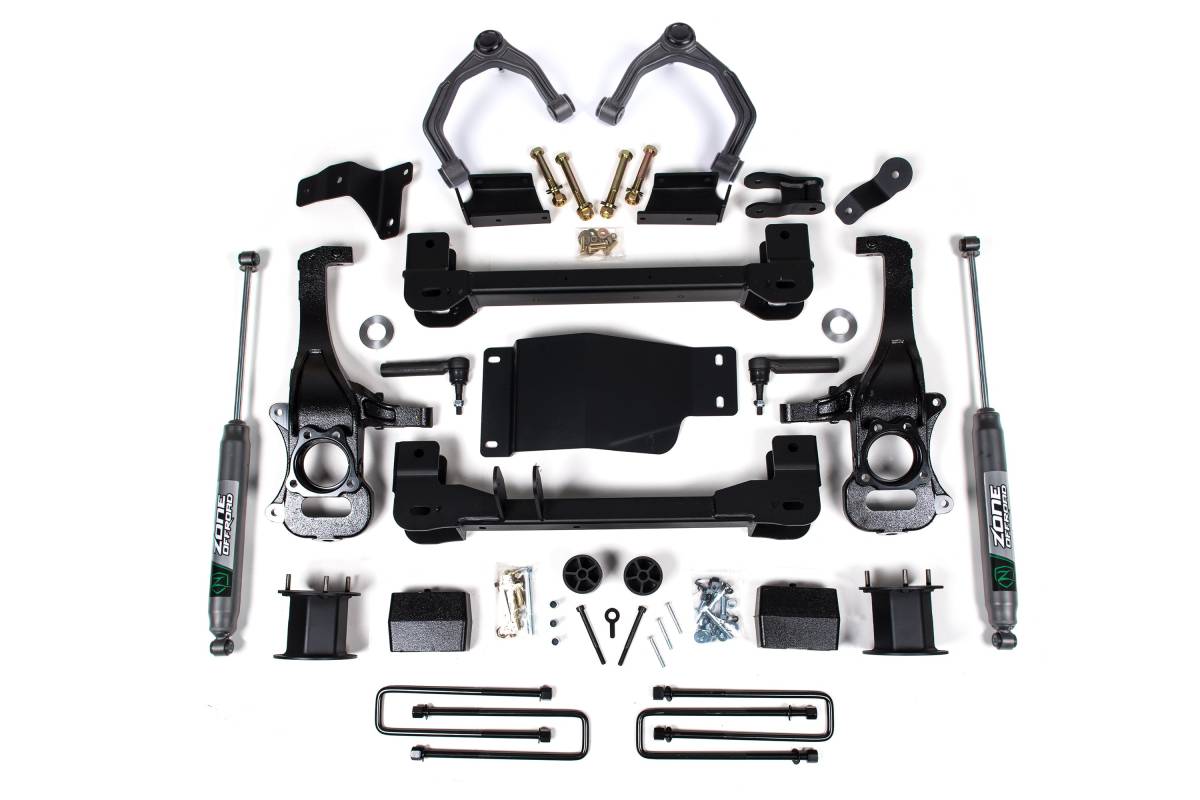 This 4" lift kit from Zone Offroad is engineered for the 2019–2024 Chevrolet Silverado 1500 and GMC Sierra 1500 4WD. The kit includes high-strength crossmembers, specialized steering knuckles, strut spacers, Adventure Series upper control arms, and differential relocation brackets to maintain proper driveline angles. The result is improved ground clearance, corrected geometry, and fitment for up to 35" tires.
