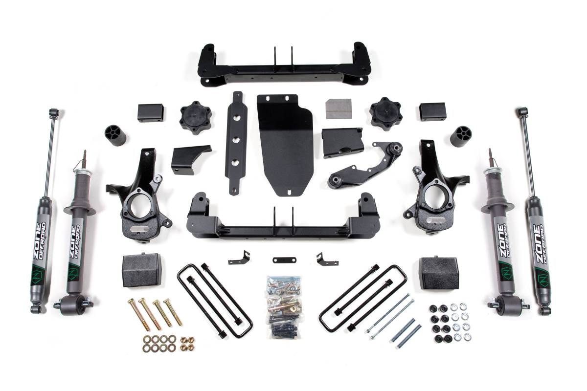 Configured for trucks with Cast Steel factory control arms. Front lift is achieved via Cross Member & Strut Spacer (6.5" front lift) with a Zone Nitro Strut, paired with Zone Nitro rear shocks and a 5" rear lift block.