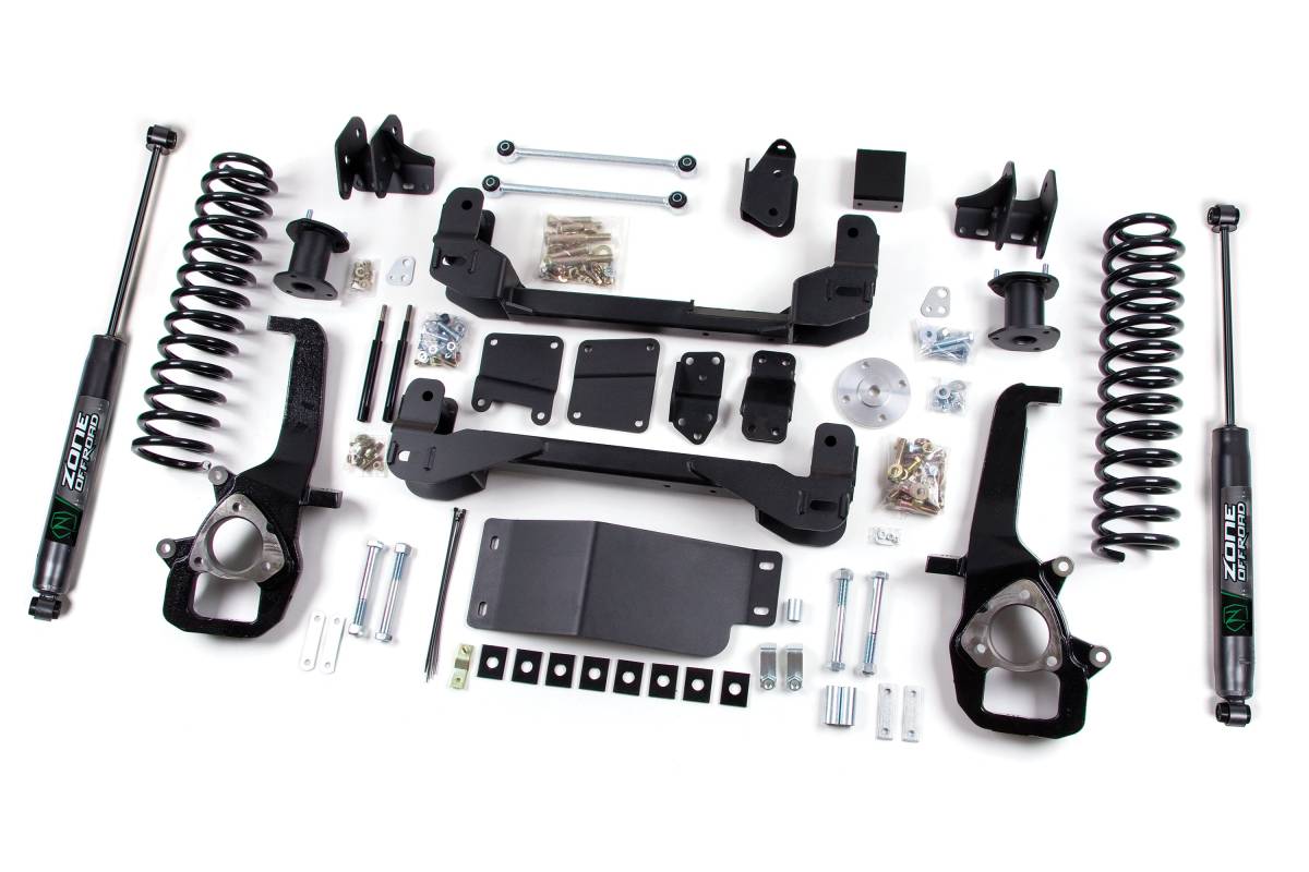 Front: Strut Spacer (Cross Member & Strut Spacer) — retains factory front struts. Rear Shocks: Zone Nitro Series — nitrogen-charged twin-tube design, 10-stage velocity-sensitive valving, dual-welded ends, self-lubricating seals, 2-inch diameter steel body, black powder coat finish. Rear Lift: 5-inch coil springs — recommended if your truck is level to approximately 1" tail high from the factory.