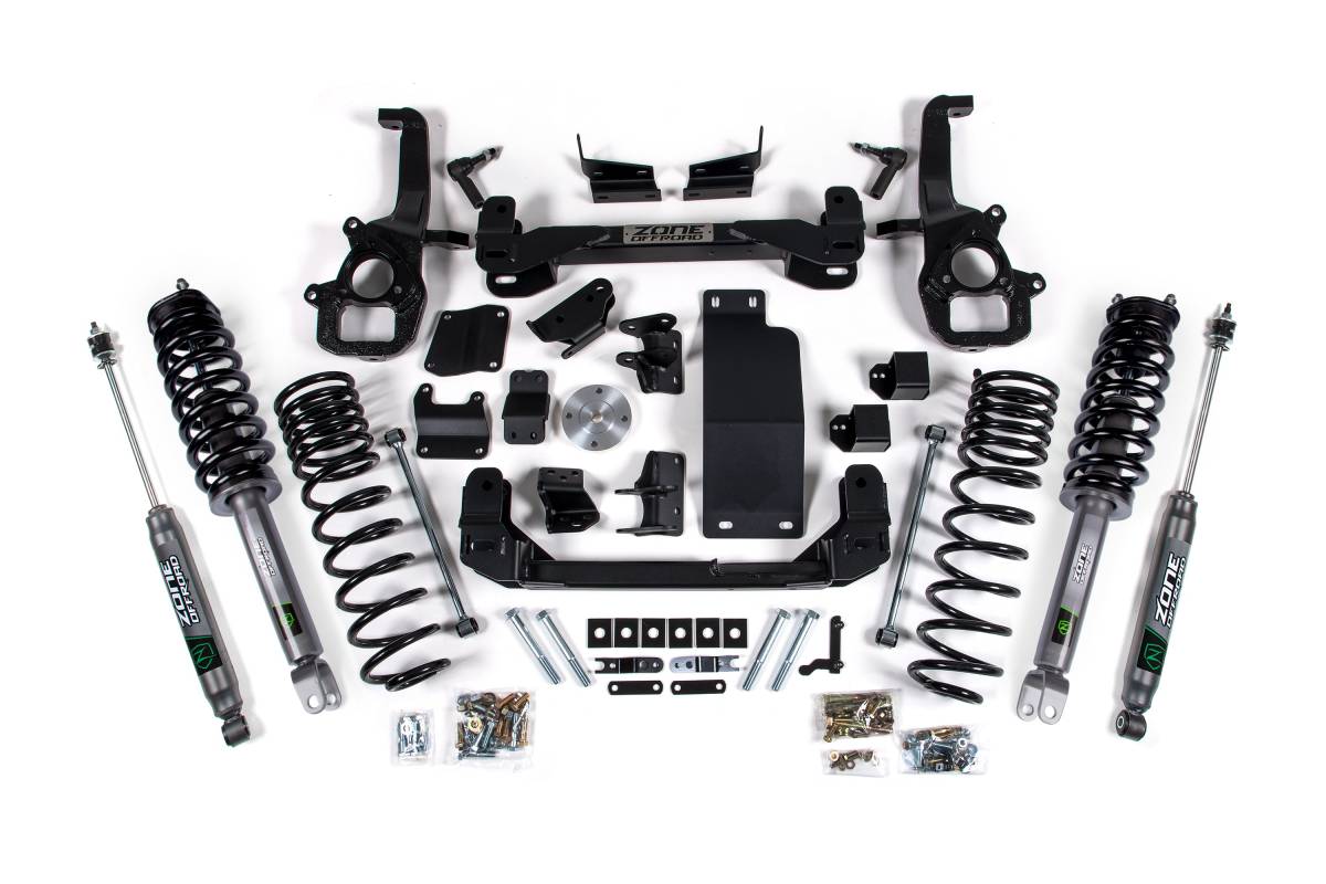 This 6-inch lift kit from Zone Offroad is designed for the 2019–2024 RAM 1500 4WD. The kit includes everything needed to achieve the lift, from high-strength crossmembers and CNC machined steering knuckles to strut spacers and differential relocation brackets, all working together to maintain correct driveline angles. Clearance is provided for up to 37-inch tires.