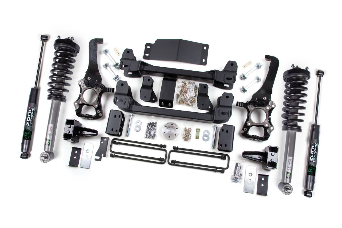 Up front, the kit is available with OE strut spacers that retain the factory front struts, or with Zone Nitro loaded struts that arrive fully assembled for a complete front suspension replacement. In the rear, a choice of 4-inch or 5-inch rear blocks allows you to dial in your preferred stance — level to slightly tail-high with the 5-inch block, or level to slightly tail-low with the 4-inch block. Rear shock options include Zone Nitro or FOX 2.0 Adventure Series.