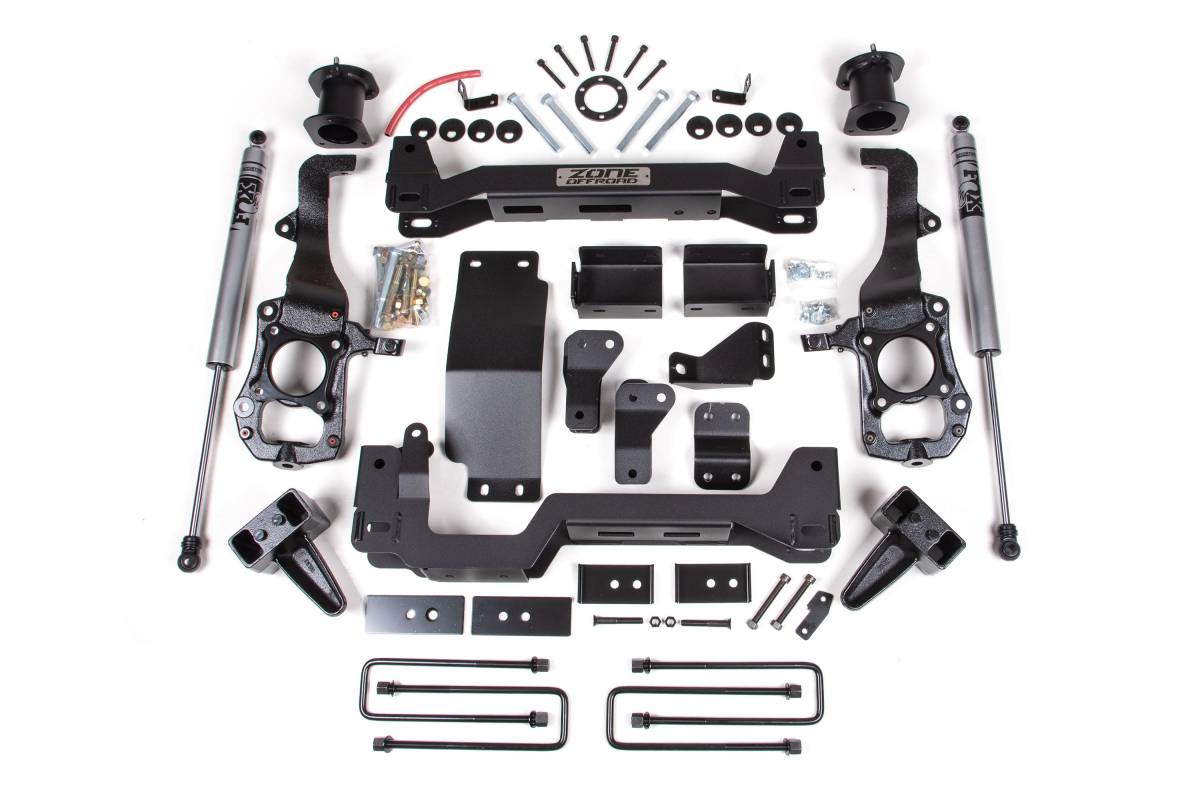 The Zone Offroad 6-Inch Lift Kit for the 2021–2026 Ford F-150 4WD delivers increased ground clearance and an aggressive stance while maintaining solid on-road handling. The system is built around precision-engineered steering knuckles that correct suspension geometry at the taller ride height. Additional components include heavy-duty crossmembers, a differential drop, sway bar drop brackets, a skid plate, rear lift blocks, and new U-bolts for a complete, properly engineered suspension upgrade. This kit is Made in the USA.