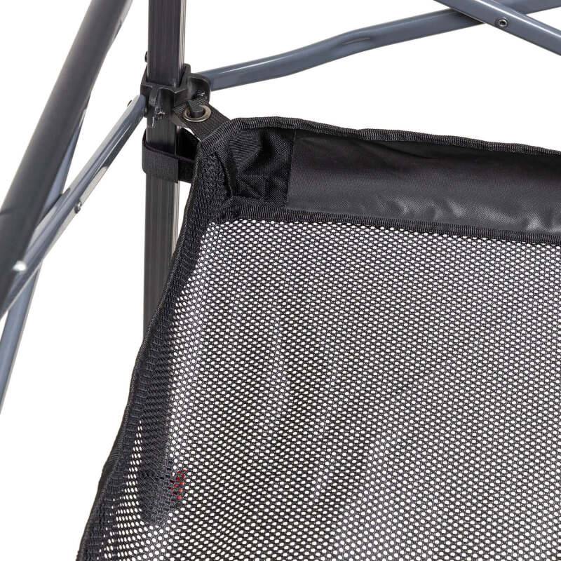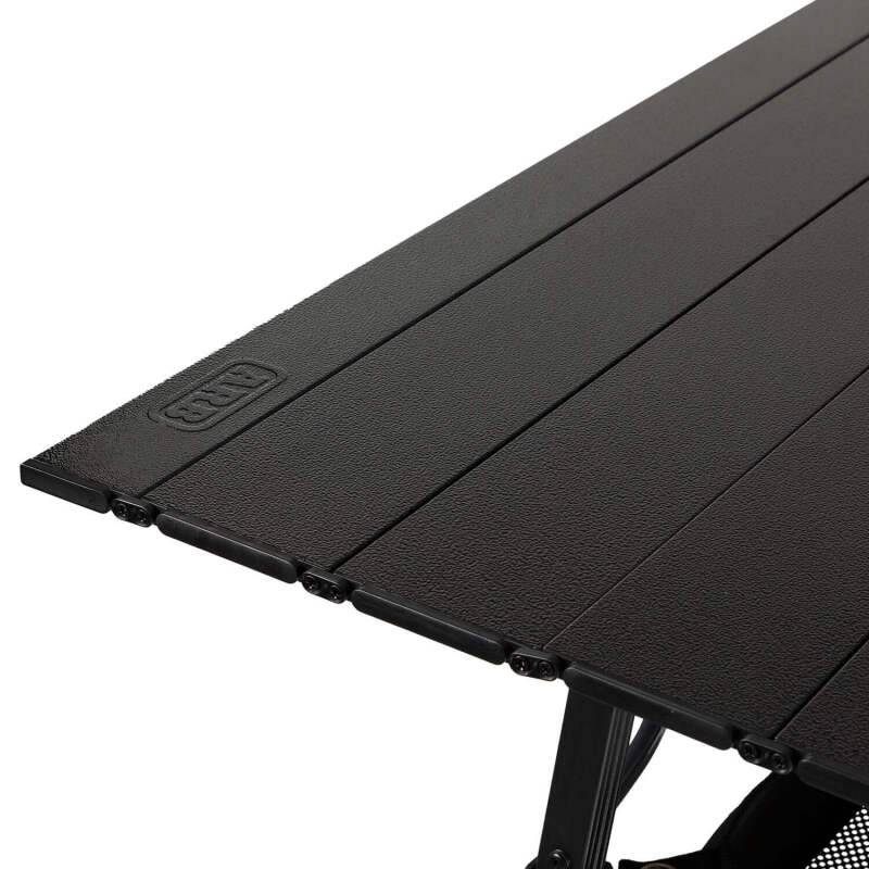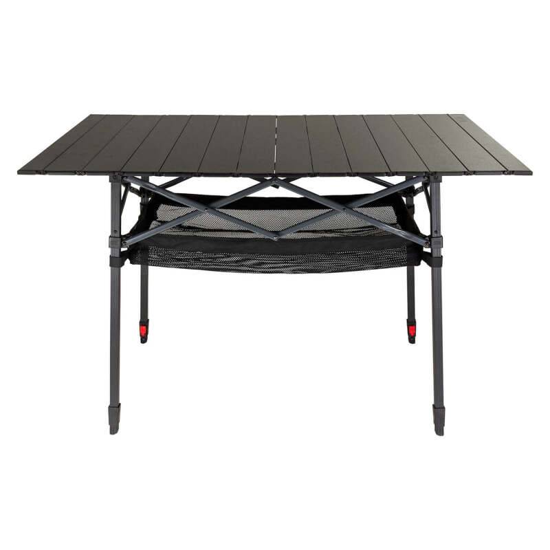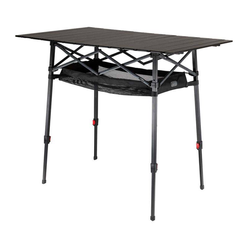 The ARB Pinnacle Camp Table is perfect for cooking and eating on the move. Its durable frame is made from black aluminum with contrasting charcoal crossbars. The generously sized, black, rugged tabletop provides ample space for mealtime or game night. Each leg can be independently adjusted to allow for stability on uneven surfaces, and the table height can be adjusted anywhere from 31 to 39 inches. The built-in brackets on the frame hold the included mesh basket for added storage. The table packs into a compact 600D polyester carry bag featuring a built-in internal divider to separate the tabletop from the frame.