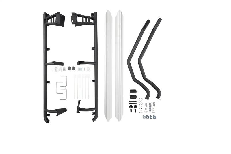 Side rail and combination steps to protect the front quarter panels and lower sills. The integrated step offers improved vehicle access. While they offer an excellent barrier against rock ledges, they are not considered a true rock slider that might be required for aggressive rock crawling.