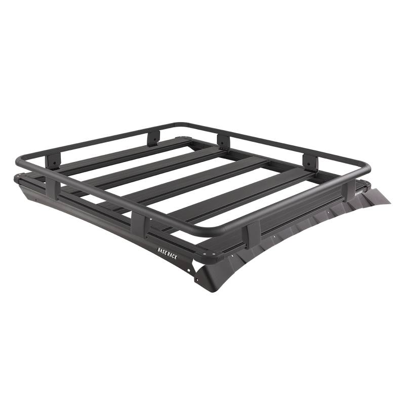 The BASE Rack takes accessories and cargo loading to a whole new level of simplicity, speed, and personalization. The BASE Rack is fully-welded aluminum for lightweight strength that doesn't flex under load. It can therefore be mounted close to the vehicle roof for a slimline aesthetic and reduced drag. Its dovetail extrusion attachment system runs the full perimeter of the rack and along each internal beam providing endless mounting and attachment options. Adding, removing, and repositioning accessories and roof loads is quick and easy and individual items may be installed or removed without disturbing the whole load. Unlike traditional roof rack channels, the BASE Rack dovetail system doesn't collect dust and debris. This kit includes a 49 in (L) x 45 in (W) BASE Rack, mount kit with wind deflector to suit the Toyota Tacoma along with full guard rails. The rails attach quickly and easily to the dovetail extrusion around the rack's perimeter with some additional fixing points at the rack corners. A full guard rail system can be taken on or off in just a few minutes. The rails running around the perimeter of the rack act as a load block, helping to prevent larger items from shifting when loading and unloading, as well as during transit.