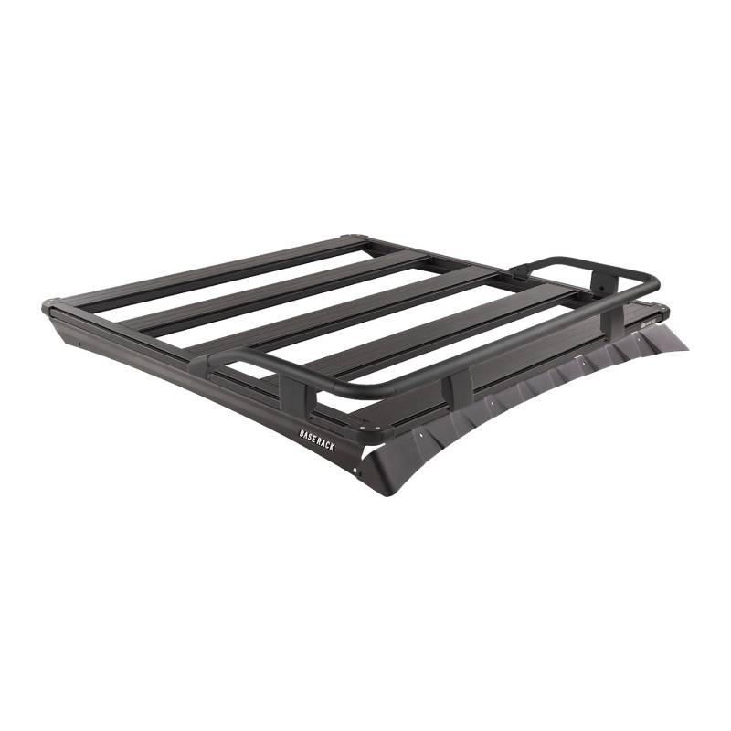 The BASE Rack takes accessories and cargo loading to a whole new level of simplicity, speed, and personalization. The BASE Rack is fully-welded aluminum for lightweight strength that doesn't flex under load. It can therefore be mounted close to the vehicle roof for a slimline aesthetic and reduced drag. Its dovetail extrusion attachment system runs the full perimeter of the rack and along each internal beam providing endless mounting and attachment options. Adding, removing, and repositioning accessories and roof loads is quick and easy and individual items may be installed or removed without disturbing the whole load. Unlike traditional roof rack channels, the BASE Rack dovetail system doesn't collect dust and debris. This kit includes a 49 in (L) x 45 in (W) BASE Rack, mount kit with wind deflector to suit the Toyota Tacoma along with quarter guard rails. The rails attach quickly and easily to the dovetail extrusion around the rack's perimeter with some additional fixing points at the rack corners. Quarter rails allow for ample storage and load security at the front of the rack.