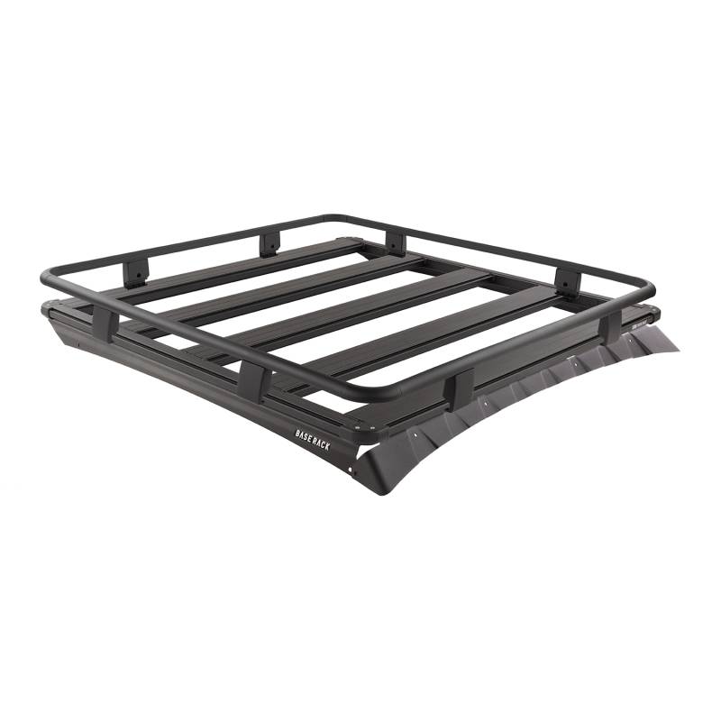 The BASE Rack takes accessories and cargo loading to a whole new level of simplicity, speed, and personalization. The BASE Rack is fully-welded aluminum for lightweight strength that doesn't flex under load. It can therefore be mounted close to the vehicle roof for a slimline aesthetic and reduced drag. Its dovetail extrusion attachment system runs the full perimeter of the rack and along each internal beam providing endless mounting and attachment options. Adding, removing, and repositioning accessories and roof loads is quick and easy and individual items may be installed or removed without disturbing the whole load. Unlike traditional roof rack channels, the BASE Rack dovetail system doesn't collect dust and debris. This kit includes a 49 in (L) x 51 in (W) BASE Rack, mount kit with wind deflector to suit the Toyota Tacoma along with full guard rails. The rails attach quickly and easily to the dovetail extrusion around the rack's perimeter with some additional fixing points at the rack corners. A full guard rail system can be taken on or off in just a few minutes. The rails running around the perimeter of the rack act as a load block, helping to prevent larger items from shifting when loading and unloading, as well as during transit. The wider rack option allows for more accessories to be hung to the side without interference with the vehicle. It also allows for certain accessories such as aux lights to be mounted underneath the rack and for accessories to be mounted east-west (e.g., recovery boards) offering greater flexibility with cargo loading.