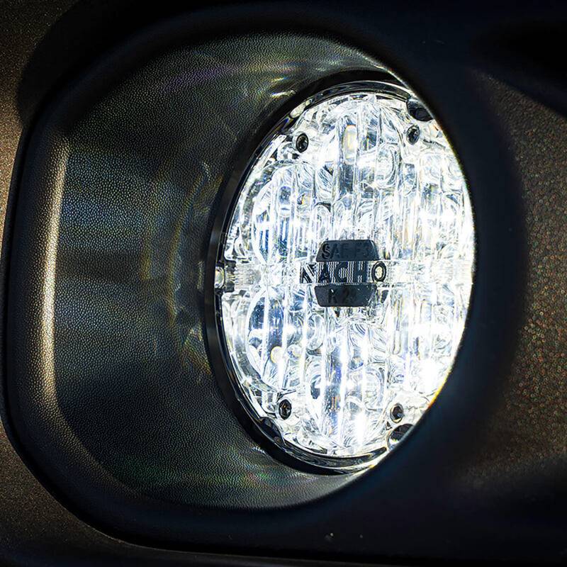 The NACHO Plug N Play Kit is exactly that. This kit comes with everything needed to swap out your stock fog lights in your three-piece plastic bumper and bring style and more usable output to your fog lights. The kit consists of 2 Quatro SAE White lights, 2 mounting brackets, and OEM connectors for the lights to plug directly into the factory fog light plug. This makes for a quick and easy swap while maintaining the factory switching and the piece of mind. The Quatro SAE is still equipped with our TRL or Trail Running Light and includes a light connector and fuse tap harness to power the TRL to your auxiliary power.