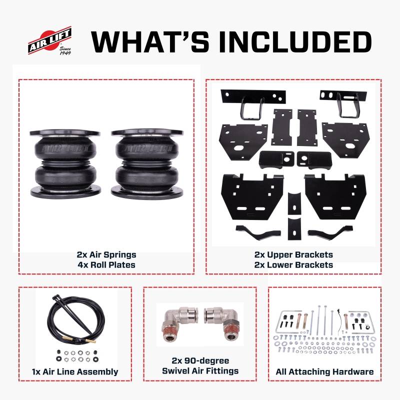 Offering up to 7,500 pounds of load-leveling capacity, the LoadLifter 7500 XL Ultimate kit for the 2023-2025 Ford F-450 4WD from Air Lift will make towing and hauling a comfortable and stress-free experience. Our fully adjustable, industry-leading air springs are the perfect upgrade for your vehicle and work to eliminate any issues you might face when towing and hauling, such as vehicle squat, poor headlight aim, trailer sway, body roll, and bottoming out. While maintaining exclusive features from our other systems, including roll plates for added protection and ultra-high-strength composite formula end caps, what sets the LoadLifter 7500 XL kit apart is a pair of massive 7-inch, double-convoluted bellows air springs. The larger air springs allow for greater leveling abilities at lower air pressures compared to similar systems, keeping your cargo safe and secure while ensuring a more comfortable ride. Installing the kit is simple, requiring only common hand tools and no frame drilling. The LoadLifter 7500 XL Ultimate kit has clear, easy-to-follow instructions and an underframe design that works with most in-bed hitches. As the leader in air suspension products for over 75 years, Air Lift is committed to delivering quality load support products that fit, work, and last. To ensure the highest quality, longevity, and customer satisfaction, the key suspension components, including the air springs and all hardware, have all been torture-tested to 1 million cycles on our hydraulic test rig. With a limited lifetime warranty, a 60-day ride satisfaction guarantee, and a dedicated in-house customer service team, you can purchase this kit with peace of mind. Do not exceed the vehicle's gross vehicle weight rating (GVWR). Internal jounce bumper absorbs shock and can be safely run with zero PSI. Offering up to 7,500 pounds of load-leveling capacity, the LoadLifter 7500 XL Ultimate kit for the 2023-2025 Ford F-450 4WD from Air Lift will make towing and hauling a comfortable and stress-free experience. Our fully adjustable, industry-leading air springs are the perfect upgrade for your vehicle and work to eliminate any issues you might face when towing and hauling, such as vehicle squat, poor headlight aim, trailer sway, body roll, and bottoming out. While maintaining exclusive features from our other systems, including roll plates for added protection and ultra-high-strength composite formula end caps, what sets the LoadLifter 7500 XL kit apart is a pair of massive 7-inch, double-convoluted bellows air springs. The larger air springs allow for greater leveling abilities at lower air pressures compared to similar systems, keeping your cargo safe and secure while ensuring a more comfortable ride. Installing the kit is simple, requiring only common hand tools and no frame drilling. The LoadLifter 7500 XL Ultimate kit has clear, easy-to-follow instructions and an underframe design that works with most in-bed hitches. As the leader in air suspension products for over 75 years, Air Lift is committed to delivering quality load support products that fit, work, and last. To ensure the highest quality, longevity, and customer satisfaction, the key suspension components, including the air springs and all hardware, have all been torture-tested to 1 million cycles on our hydraulic test rig. With a limited lifetime warranty, a 60-day ride satisfaction guarantee, and a dedicated in-house customer service team, you can purchase this kit with peace of mind. Do not exceed the vehicle’s gross vehicle weight rating (GVWR). Internal jounce bumper absorbs shock and can be safely run with zero PSI.