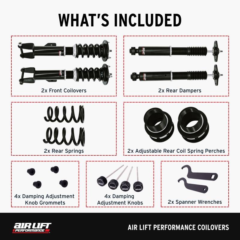 Built for enthusiasts, backed by legacy. Air Lift Performance Coilovers deliver superior quality, an aggressive stance, and a sporty ride you can trust. Get a lowered stance while still experiencing the best quality, designed for durability and performance. Our coilovers are the perfect solution for getting a static setup with a lowered stance, without the need for air adjustability, but are still comfortable for daily driving. Air Lift Performance Coilover kits are designed for drivers who want to eliminate wheel gap and lower their stance without sacrificing performance or quality. Once the kit is installed, your ride will maintain its lowered stance without needing to be adjusted. Each kit is engineered with vehicle-specific mounts for an accurate bolt-on installation. As well as vehicle-specific valving and internal pressure, delivering a balance of comfort and performance tailored to your setup. Air Lift Performance Coilovers are equipped with 32-way damping adjustment, monotube dampers, anodized aluminum damper bodies, top mounts, locking collars and spring perches, vehicle-specific upper and lower mounts for a bolt-on installation, and vehicle-specific valving. With the ability to convert to a complete air suspension system via a coilover-to-air conversion kit (coming soon), you can enjoy your new static stance or convert to air when you're ready and lay your ride on the ground. We love the performance vehicle world and wanted to bring more to the Air Lift community. With air suspension and coilover options, we can now support the entire lowered car community. Built for enthusiasts, backed by legacy. Air Lift Performance Coilovers deliver superior quality, an aggressive stance, and a sporty ride you can trust. Get a lowered stance while still experiencing the best quality, designed for durability and performance. Our coilovers are the perfect solution for getting a static setup with a lowered stance, without the need for air adjustability, but are still comfortable for daily driving. Air Lift Performance Coilover kits are designed for drivers who want to eliminate wheel gap and lower their stance without sacrificing performance or quality. Once the kit is installed, your ride will maintain its lowered stance without needing to be adjusted. Each kit is engineered with vehicle-specific mounts for an accurate bolt-on installation. As well as vehicle-specific valving and internal pressure, delivering a balance of comfort and performance tailored to your setup. Air Lift Performance Coilovers are equipped with 32-way damping adjustment, monotube dampers, anodized aluminum damper bodies, top mounts, locking collars and spring perches, vehicle-specific upper and lower mounts for a bolt-on installation, and vehicle-specific valving. With the ability to convert to a complete air suspension system via a coilover-to-air conversion kit (coming soon), you can enjoy your new static stance or convert to air when you’re ready and lay your ride on the ground. We love the performance vehicle world and wanted to bring more to the Air Lift community. With air suspension and coilover options, we can now support the entire lowered car community.