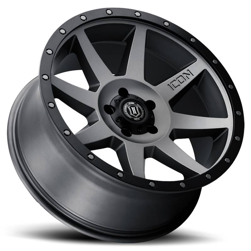 Constructed using a high-strength aluminum alloy the 20” 'Rebound' yields a 2,750 pound load rating that will withstand daily driven use, tow/haul duty, and spirited off-road adventures! These wheels are available in our signature Bronze, Satin Black or Titanium finishes and maintain ICON Alloys’ commitment to producing wheels that deliver on fit, style, and strength. Constructed using a high-strength aluminum alloy the 20” 'Rebound' yields a 2,750 pound load rating that will withstand daily driven use, tow/haul duty, and spirited off-road adventures! These wheels are available in our signature Bronze, Satin Black, Double Black, or Titanium finishes and maintain ICON Alloys’ commitment to producing wheels that deliver on fit, style, and strength. ICON Alloys is pleased to announce the arrival of new 20" sizes of our best-selling 'Rebound' wheel designed for today’s most popular 5-lug and 6-lug applications. Combining sharp lines, a concave spoke design, and color-matched rock ring bolts the new 20x9 ‘Rebound’ has a style that is anything but ordinary. These new wheels not only enhance the appearance of the most common vehicles, but also improve function with "ICON-optimized" backspacing that provides better wheel fitment, maximized caliper clearance, reduced scrub radius, and unhindered suspension travel.