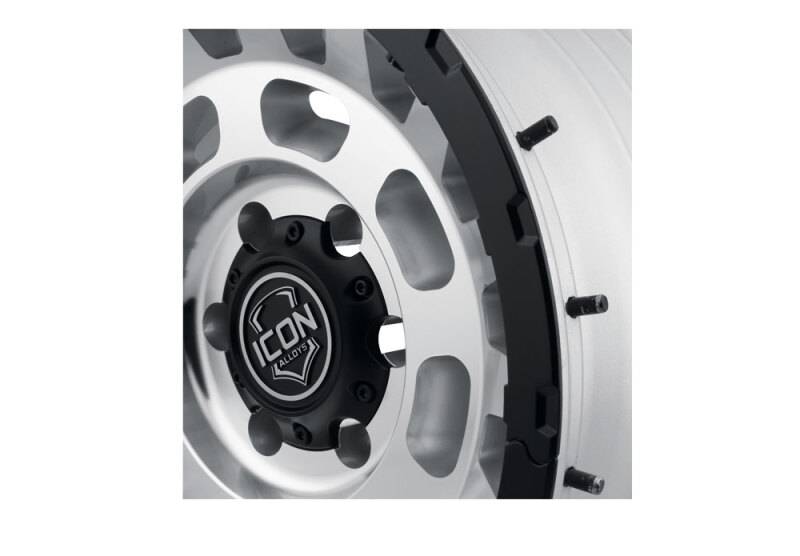 Any hardcore off-road enthusiast knows the numerous benefits that lower tire pressures offer such as improved ride quality and a larger contact patch for increased traction. However, low pressures also increase the risk of de-beading the tire during extreme side loads or aggressive driving. While traditional bead lock wheels address this issue by clamping the tire’s bead, they also need frequent maintenance, require specialty tools/parts, increase rotational mass, and are NOT legal for on-road use. During an accelerated R&D process ICON engineers subjected the InnerLock technology to thousands of miles of real-world abuse throughout harsh and unforgiving environments. After on-vehicle testing was concluded, wheels were sent to an independent contractor for precise lab testing, specifically the FMVSS No.139 Tire Bead Unseat Resistance Test (modified to 10 psi). Results from multiple tests validated the effectiveness of ICON’s InnerLock technology by exceeding the mechanical limits of the machine (over 7600lbs load) without ever de-beading the tire. Staying true to the ICON Alloys approach, the Hammer PRO has been engineered to maximize caliper clearance and optimize wheel position for un-hindered suspension travel and steering function. Backspace and wheel offset dimensions have been strategically developed to reduce scrub radius, improving all-around handling and ride quality. The Hammer PRO has also been strength tested to yield an incredible 3,650lb load rating - making it one of the strongest wheel options on the market. With build features such as these, it's clear that a set of ICON Alloys Hammer PRO wheels is the perfect complement to any truck, Jeep, or SUV. The ICON Alloys Hammer PRO with patented InnerLock technology offers the best of both worlds by using a robust bead retention system to keep the tire bead secured to the wheel while also being fully DOT compliant. This provides confidence in knowing that your wheels are prepared to tackle whatever situation you encounter - on or off the beaten path. InnerLock is ready for any type of terrain and every single adventure. The included high-grade aluminum, removable, and replaceable HALO Wheel Armor keeps the wheel looking new by protecting the Hammer PRO from trail rash. This HALO Wheel Armor is replaceable in 90° segments so individual sections can be changed if only a portion of the ring becomes damaged. Beyond superior form and function the HALO Wheel Armor can be easily customized to match your style for a truly unique wheel experience.