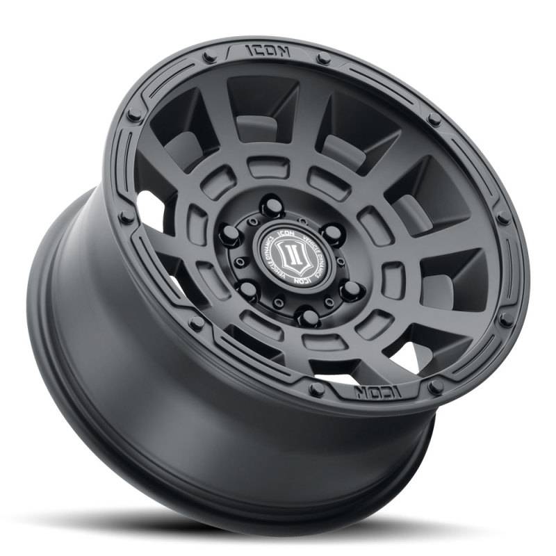 Combining sharp concave lines, a unique lip design with imprinted logos, and "ICON-optimized" dimensions, the ‘Thrust’ wheel is not only designed to improve the looks of your Jeep, truck, or SUV, but the overall function of the vehicle as well. Available in all-new Smoked Satin Black and our classic Satin Black finishes, the Thrust has a style that is anything but ordinary. Staying true to the ICON Alloys approach, the 17” Thrust has been engineered to maximize caliper clearance and optimize wheel position for un-hindered suspension travel and steering function. Backspace and wheel offset dimensions have been strategically developed to reduce scrub radius, improving all-around handling and ride quality. The ICON Alloys Thrust has also been strength tested to yield a 2,750lb load rating - making it one of the strongest wheel options on the market! With build features such as these, it's clear that a set of ICON Alloys Thrust wheels is the perfect complement to an ICON Vehicle Dynamics suspension system.